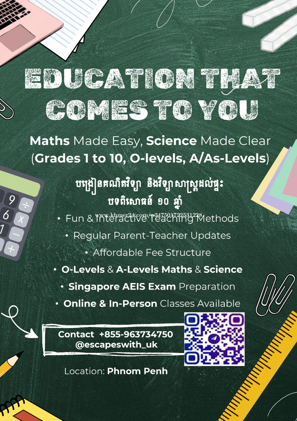 សិក្សាផ្ទះ UK Tutor Academy គណិតវិទ្យា និងវិទ្យាសាស្ត្រ បទពិសោធន៍ ១០ ឆ្នាំ វិធីសាស្ត្រសិក្សាម៉ាកសំណើច និងគួរឱ្យចាប់អារម្មណ៍ ឱ្យព័ត៌មានជាប្រចាំដល់ឪពុកម្តាយ ថ្លៃសិក្សាប្រកាន់តម្លៃសមរម្យ ថ្នាក់ទី 1 ដល់ 12 | គណិតវិទ្យា និងវិទ្យាសាស្ត្រ O-Levels និង A-Levels រៀបចំសម្រាប់ប្រឡង Singapore AEIS បណ្តុះបណ្តាលគណិតវិទ្យាសម្រាប់ប្រកួតប្រជែង មានថ្នាក់សិក្សតាមអនឡាញ និងនៅផ្ទះ 📍 ទីតាំង៖ ភ្នំពេញ 📱 Telegram: +8559637xxxClick To Call50 | @escapeswith_uk UK Tutor Academy Math and Science Home Tutoring 10 Years of Experience Fun & Interactive Teaching Methods Regular Parent-Teacher Updates Affordable Fee Structure Grade 1 to 12 | O-Levels & A-Levels Maths & Science Singapore AEIS Exam Preparation Competition Maths Coaching Online & In-Person Classes 📍 Location: Phnom Penh 📱 Telegram: +8559637xxxClick To Call50 | @escapeswith_uk https://t.me/escapeswith_uk