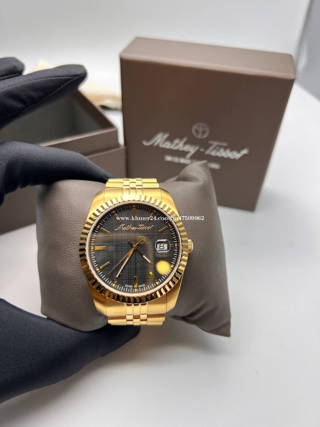 Mechanism: Analog(Quartz) Feature: Date Dial Color: Black Dial Shape: Round Dial Size approx: 38mm Glass: Sapphire Case Color: Gold Case width approx: 40mm Case Material: Stainless Steel Band Color: Gold Band Material: Stainless Steel Water Resistance: 50 Meter Warranty: 1 Year Free delivery