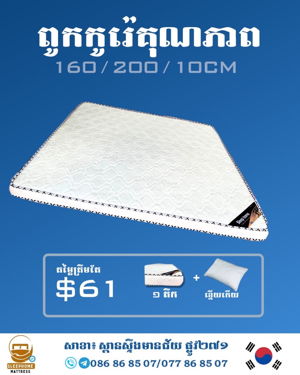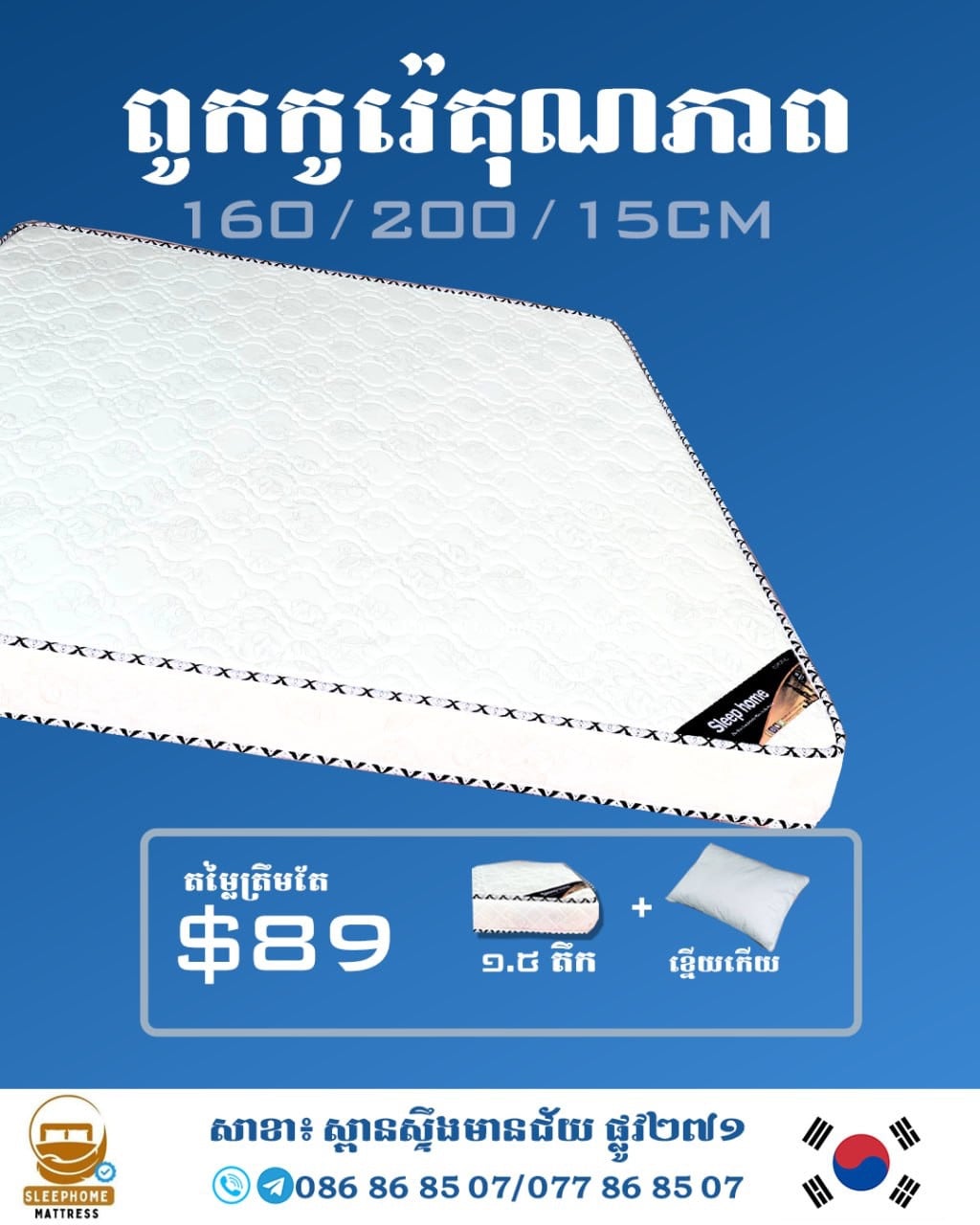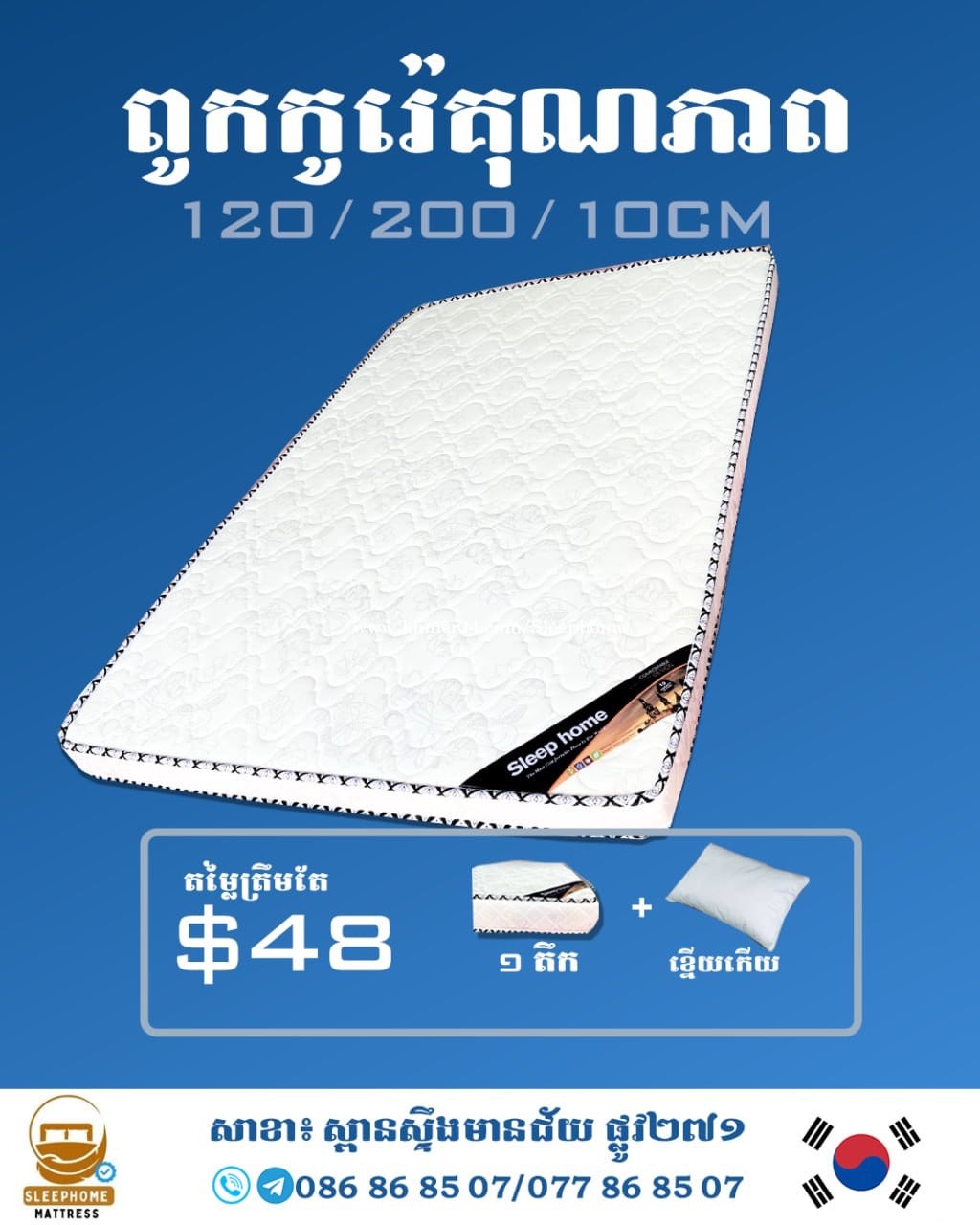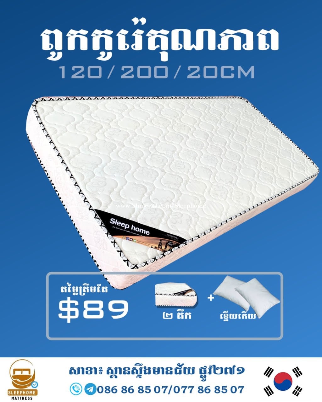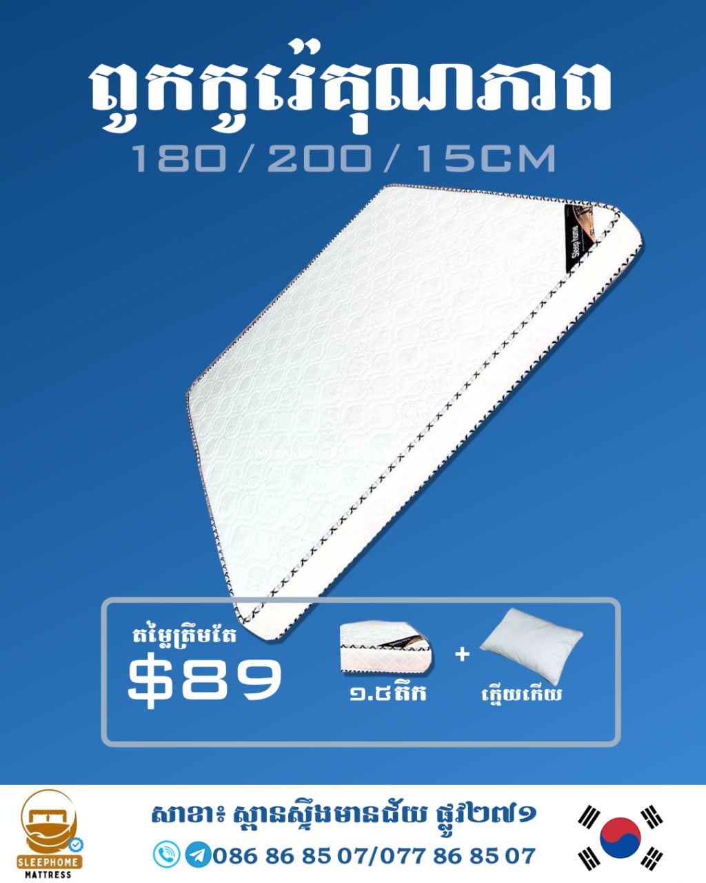✨ គុណភាពពិសេស – ផលិតពីប្រទេសកូរ៉េ 🛏️ ពូកសុខភាពធានា ១០ ឆ្នាំពេញ ⚡ ដឹកជញ្ជូនរហ័សក្នុងថ្ងៃតែមួយ 📏 មាន ៣៦ ទំហំផ្សេងៗ 🎁 ពិសេសសម្រាប់ពេលខ្លីនេះប៉ុណ្ណោះ! 👉 ទិញពូកសុខភាពទទួលបាន អំណោយឥតគិតថ្លៃ (ខ្នើយ / ឈុតកម្រាលពូក) 🔥 ប្រញាប់ឡើង – បញ្ជាទិញឥឡូវនេះ ចំនួនមានកំណត់! 📍 សាខា : ស្ពានស្ទឹងមានជ័យ ផ្លូវ ២៧១ 086868xxxClick To Call Telegram > https://t.me/Sleephomes #mattress