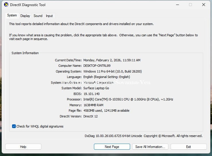 Model: Surface Laptop Go Processor: Intel(R) Core(TM) i5-1035G1 CPU @1.00GHz (8 CPUs), ~1.2GHz RAM: 16GB HDD: M.2 256GB Display resolution: 1536 x 1024 Screen: 12.4‑inch touchscreen display