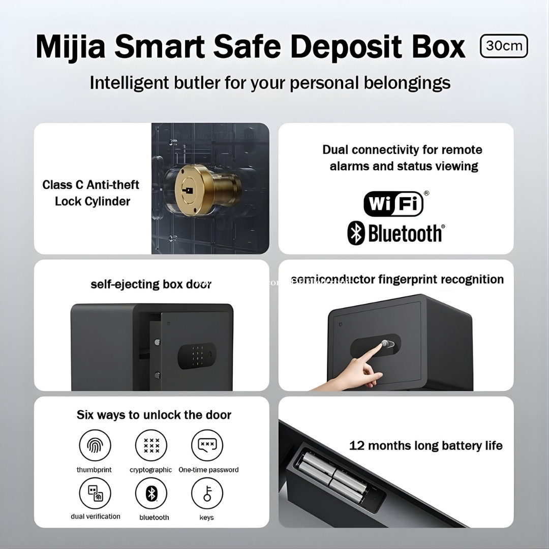 នេះគឺជាទូរដែកជំនាន់ថ្មី Mijia Smart Safe Box 30cm អាចដោះសោរបានរហូតដល់ទៅ 6 របៀប (ប្រើកូនសោរ, ស្កេនក្រយ៉ៅដៃ, លេខកូដសម្ងាត់, Bluetooth Unlock, One-time Password ,Two-Step Verification Unlock) សម្រាប់រក្សាទុកវត្ថុ ឯកសារ និងទ្រព្យសម្បត្តិដ៏មានតម្លៃ 💲ទិញឥឡូវនេះបញ្ចុះតម្លៃសល់ត្រឹមតែ 141$ តែប៉ុណ្ណោះ (តម្លៃពេញ 149$) 🛡ធានារយៈពេល 6 ខែ 🛵ដឹកជញ្ជូនឥតគិតថ្លៃទូទាំងប្រទេស 🔘លក្ខណៈពិសេស ☑️មាន 6 វិធីដើម្បីដោះសោរ ☑️ ផ្ទាំងខាងក្រៅធ្វើពីដែក Cold Rolled Steel – រឹងមាំ និងធន់ ☑️ មាន សំឡេងរោទ៌ ពេលមានការប៉ះទង្គិច ឬបើកខុសលេខកូដច្រើនដង ☑️ ភ្ជាប់បានទាំង Wi-Fi និង Bluetooth ☑️ ភ្ជាប់ជាមួយ Mi Home App ☑️ ដំណើរការដោយ ថ្ម AA 4 គ្រាប់ ប្រើបានរហូតដល់ 12 ខែ ☑️ ទម្ងន់៖ 15.5kg ☑️ទំហំ៖ 300x300x400mm