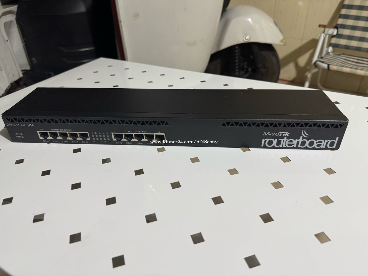 Router MikroTik RB2011iL-RM ស្ថានភាពល្អ ប្រើការបានធម្មតា មិនមានបញ្ហា Details: • 5× Fast Ethernet (10/100) • 5× Gigabit Ethernet • RouterOS License Level 4 • Rackmount 1U • សមស្របសម្រាប់ Home lab, Office តូច, រៀន MikroTik Condition: ✔️ 100% working ✔️ Clean, no repair Price: $65 (ចរចាបាន) 📩 Inbox / PM for testing