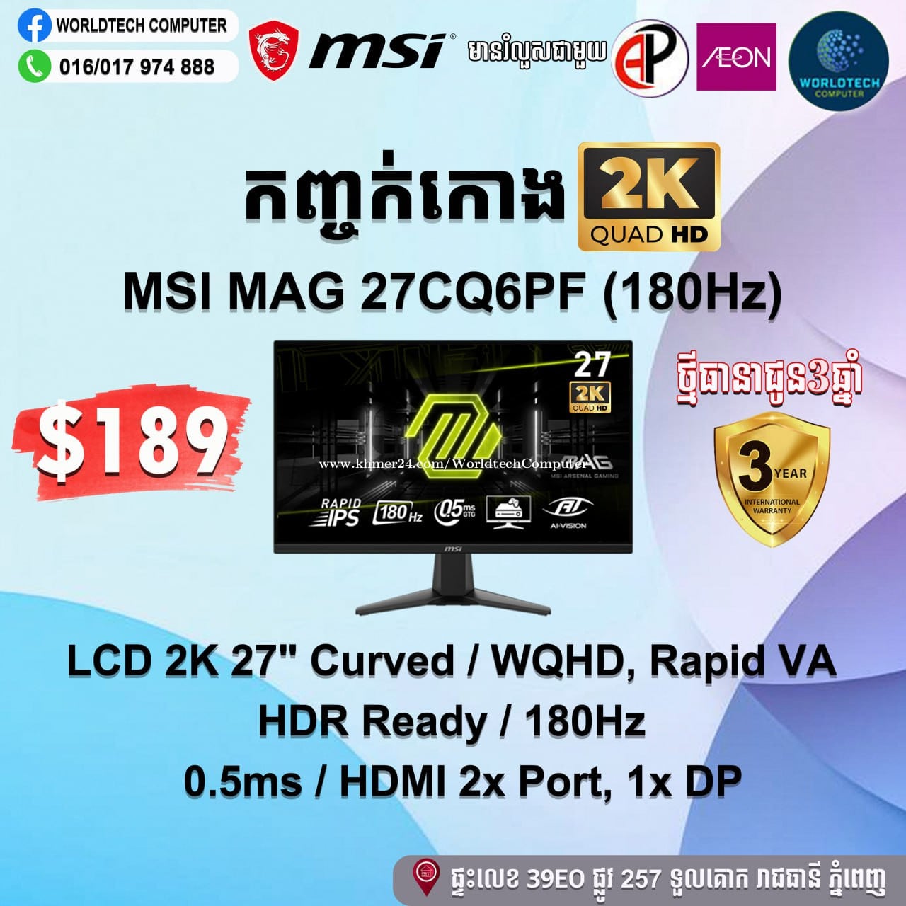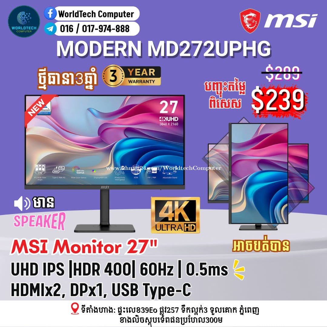 ថ្មីកេស100% ធានាជូន3ឆ្នាំ (New 2025 Warranty 3Years) Monitor Pro MP2412 24" 100Hz HDMI x1 , DP x1 New=85$ MSI LCD PRO MP251 E2 25" FHD, IPS 120Hz 1ms HDMI, VGA SPEAKER=95$ MSI LCD Monitor MP275 27" IPS 100Hz| HDMI , DP, VGA| Speaker New2025=107$ MSI LCD Monitor Pro MP275Q | 27" IPS 2K |100Hz| DP x1, HDMI x2 New2025=149$ MSI LCD Monitor Pro MP275U | 27" IPS 4K |60Hz| DP x1, HDMI x2 New2025=199$ MSI MODERN MD272UPHG | 27" IPS 4K |60Hz| DP x1, HDMI x2 , Type-C New2025=239$ Telegram: 017974xxxClick To Call , 011777xxxClick To Call ទីតាំងហាង: ផ្ទះ39Eo ផ្លូវ257 ទឹកល្អក់3 ទួលគោក ភ្នំពេញ (ខាងលិចស្តុបទេពផនប្រហែល 300ម)។ Location: #39E0 St257, Tuol Kouk , Tuek L'ak Bei , Phnom Penh