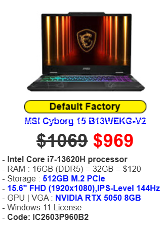 MSI Cyborg 15 B13WEKG-V2 - Intel Core i7-13620H processor - RAM : 16GB (DDR5) = 32GB = $120 - Storage : 512GB M.2 PCIe - 15.6" FHD (1920x1080),IPS-Level 144Hz - GPU | VGA : NVIDIA RTX 5050 8GB - Windows 11 License - Code: IC2603P960B2