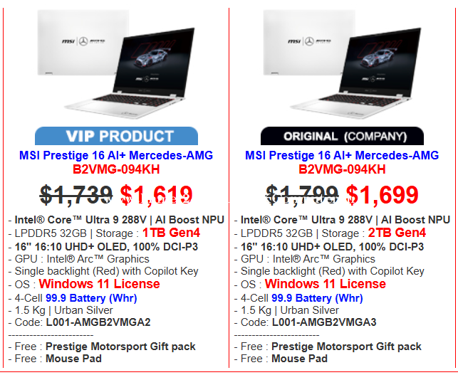 MSI Prestige 16 AI+ Mercedes-AMG B2VMG Price : $1,799 > $1,699 >> $1669 ----------------------------------- - Intelยฎ Coreโข Ultra 9 288V | AI Boost NPU - LPDDR5 32GB | Storage : 2TB Gen4 - 16" 16:10 UHD+ OLED, 100% DCI-P3 - GPU : Intelยฎ Arcโข Graphics - Single backlight (Red) with Copilot Key - OS : Windows 11 License - 4-Cell 99.9 Battery (Whr) - 1.5 Kg | Urban Silver ๐๐๐ ๐๐จ๐ฆ๐ฉ๐ฎ๐ญ๐๐ซ (แแแแผแแแแแแปแแถแแแแแ) โ๏ธ แแแถแแแแแแ 0950937xxxClick To Call 77 ๐ฌ Telegram : t.me/cnkcomputer93 ๐ Website: https://cnkcomputer.com/