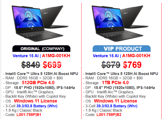 MSI Venture 15 AI | A1MG Price : $849 > $699 >> $689 -------------------------------- - Intelยฎ Coreโข Ultra 5 125H AI Boost NPU - RAM : DDR5 16GB - Storage : 512GB PCIe 4.0 - DP : 15.6" FHD (1920x1080), IPS-144Hz - GPU : Intelยฎ Arcโข Graphics - Backlit Key (White) with Copilot Key - OS : Windows 11 License - 3-Cell 39.3/53.8 Battery (Whr) - 1.9 Kg | Classic Black ๐๐๐ ๐๐จ๐ฆ๐ฉ๐ฎ๐ญ๐๐ซ (แแแแผแแแแแแปแแถแแแแแ) โ๏ธ แแแถแแแแแแ 0950937xxxClick To Call 77 ๐ฌ Telegram : t.me/cnkcomputer93 ๐ Website: https://cnkcomputer.com/