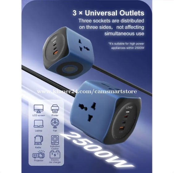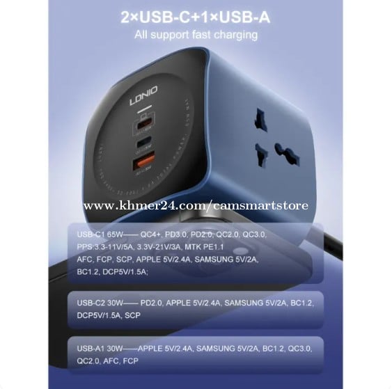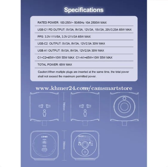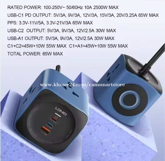 More products www.camsmartstore.com Contact Us By Telegram https://t.me/Camsmartstore Features -Anti-Slip Silicone Pad -Anti-Flaming 750°C -Space Saving Design -Support Laptop Charge Available -Smart: 65W High power, supports PD/QC3.0/PPS fast charging protocols, it can quickly charge mobile phones, tablets, laptops, and intelligently match the best current. -Globally Applicable: 100-250V wide range of input voltage, widely used in many countries and regions, to ensure that it can be applied all over the world. -High Power: 2500W output is suitable for any size of household appliances and mobile devices. -Cable Length: 2000mm heavy-duty power cord, helps ensure optimal power flow to connected devices. - Environmental Friendly: Using environmental friendly materials which are soft, elastic, anti- pulling and anti-bending. -Safety: The product has passed the national mandatory safety certification and meets the requirements of safety standards. SPECIFICATIONS Brand: LDNIO Model: SC3319 3 Power Outlets + 2USB-C + 1USB-A RATED POWER: 100-250V~ 50/60Hz 10A 2500W MAX USB-C1 OUTPUT: 5V3A, 9V3A, 12V3A, 15V3A, 20V3.25A 65W MAX PPS: 3.3V-12.6V3A, 3.3V-21V3A 65W MAX USB-C2 OUTPUT: 5V3A, 9V3A, 12V2.5A, 20V1.5A 30W MAX USB-A1 OUTPUT: 5V3A, 9V3A, 12V2.5A, 20V1.5A 30W MAX C1+C2=45W+10W 55W MAX C1+A1=45W+10W 55W MAX TOTAL POWER: 65W MAX #powersocket #PowerAdapter65W #vertical #socket #standardstrip #PowerAdapter