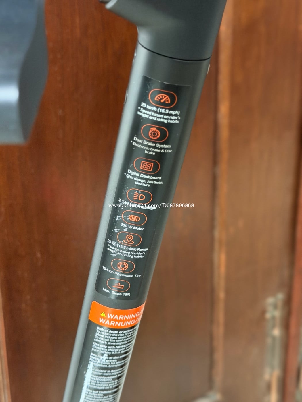 *Performance and capabilities Top Speed: (25 km/h) Range: (20 km) Motor Power: 300W nominal Max. Slope: Up to 15% grade Payload Capacity: 30-100 kg *Features Braking: Electronic front brake and a rear mechanical disc brake Lights: 2.5W high-brightness front LED headlight and rear light Tires: 10-inch Riding Modes: Eco, Standard, and Sport Ninebot 09 seat Price: 315$ with include seat.