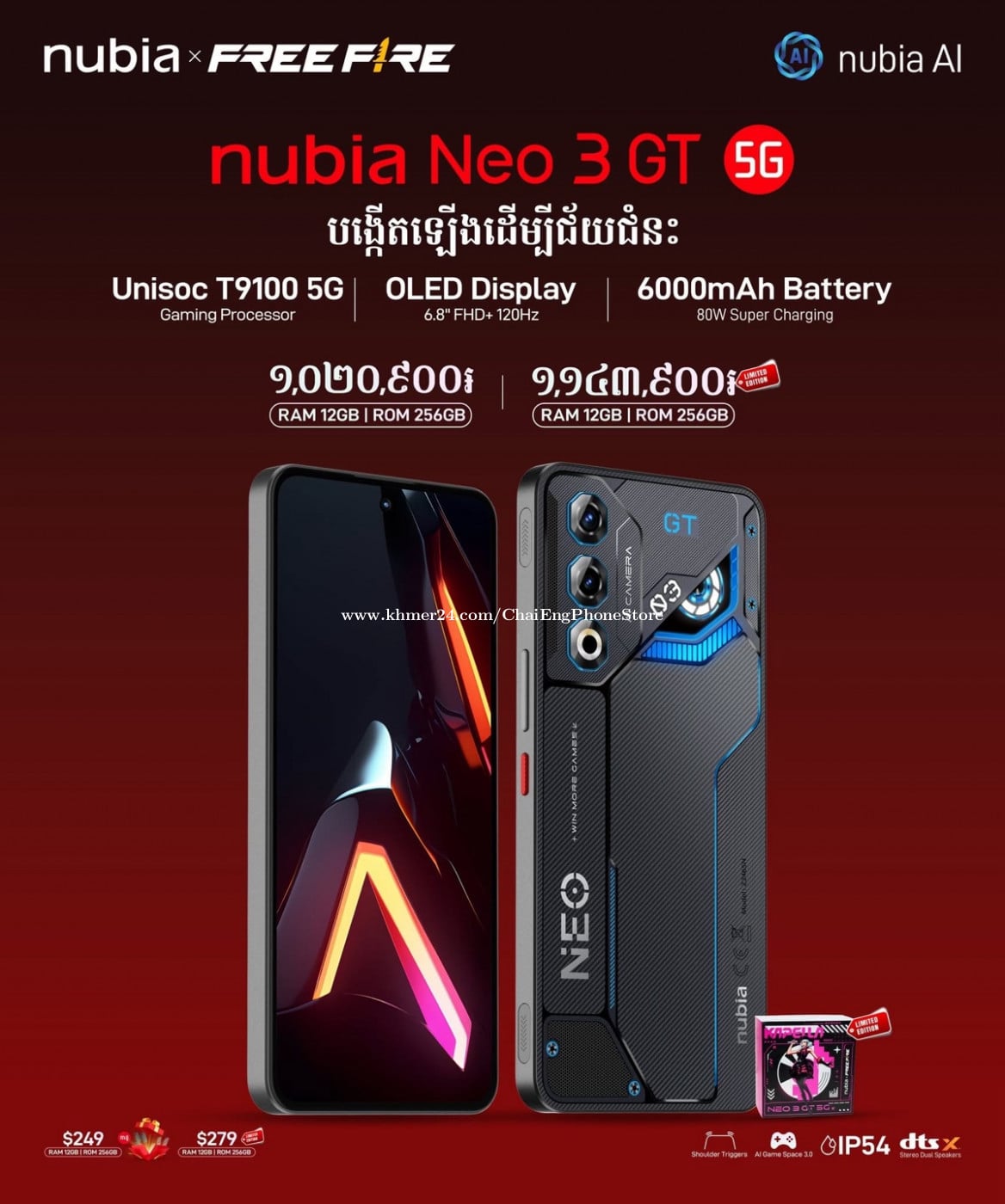 Nubia Neo3 GT5G limited Edition មកដល់ហើយ ! 👉 Ram12G+12G/Rom256GB 👉 តម្លៃត្រឹមតែ 279$ 👉 ថែមជូនកាសប្លូធូហ្សុីន តម្លៃ 49$ ការដូពីហាងផ្ទាល់🎁(បើអត់យកការដូហាងទេចុះលុយអោយ 10$ វិញ) 👉 ទិញក៏បាន | បង់រំលស់ក៏បាន | ប្រើVISA Cardក៏បាន 👉 មានបង់រំលស់តាម ACLYDA-BNPL & Aeon Bank & Amret MicroFinance 👉 មានសេវាកម្មដឹកជញ្ជូនដល់កន្លែងនិងផ្ញើរជូន25ខេត្តក្រុង សំរាប់ពត័មានបន្ថែមសូមទាក់ទងមកកាន់លេខទូរសព្ទ័ ☎️ 081333xxxClick To Call, 0762333xxxClick To Call, 017226xxxClick To Call, 067226xxxClick To Call #ChaiEngPhoneShop #CE #ChaiEngPhoneStore2
