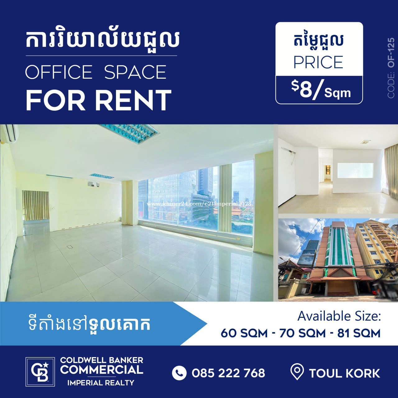 Office for rent at Toul Kork ,TK (Of-125) -Size : 81 sqm -Price : 7$/sqm -Management fee : free ----------- -Lease term : 1 years -Deposit : 2 months -Electricity fee: 0.25$/Kwh -Water fee: free -Parking : Free -VAT : excluded -Security 24 h -Ready move in