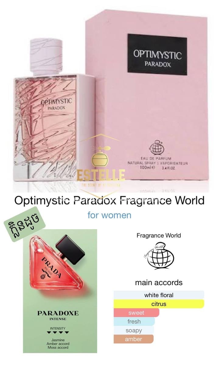 Optimistic paradox clone of Prada paradox Original perfume from Dubai Perfume: https://t.me/estellefragrances cosmetic: https://t.me/estellecosmetics ទីតាំង: បុរីវលស្បូវ ខណ្ឌ័ច្បារអំពៅ ភ្នំពេញ https://t.me/KAKEO8888