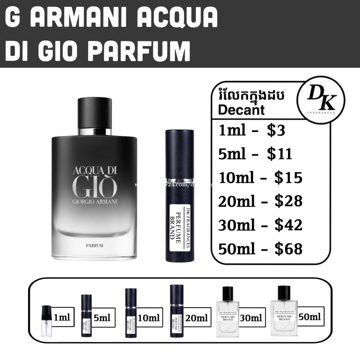 Acqua di gio parfum 100ml full box - $115 រំលែកក្នុងកូនដប/Decant in testing bottles: 1ml, 5ml, 10ml, 20ml, 30ml, 50ml. DK Fragrances គឺធានាលោកអ្នកជាមួយនឹងឥវ៉ាន់សុទ្ធ original 100%។ ជួញដូរដោយក្ដីស្មោះត្រង់។ ខាងខ្ញុំលក់ជា Full box (ដបធំ) និងរំលែកពី ដបធំ ចូលកូនដបសម្រាប់អ្នកចង់តេស្តក្លិន។ មិចបានតម្លៃធូរជាងក្នុងហាង? ដោយសារតែឥវ៉ាន់ ខាងខ្ញុំយកស្តុកចូលច្រើនៗ បានតម្លៃល្អហើយក៏ឲ្យអ្នកទិញបានតម្លៃល្អដូចគ្នា។ ទំនាក់ទំនងតាម Telegram: 011841xxxClick To Call Telegram channel: https://t.me/dkfragrancess ពត៌មានបន្ថែមអាចឆែកគេហទំព័រយើងខ្ញុំ: https://shoplinks.to/dkfragrances Note: DK Fragrances is an online-based original perfume discounter in Phnom Penh, Cambodia (Est. 2024). We sell perfumes as in Full bottle (the original bottle), and decants (original perfume liquid extracted from big bottle and transferred to vials for testing purposes). We’ve executed thousands of successful sales—check out our Instagram to see real reviews and feedback from customers. Contact us on Telegram, or visit our website. Telegram channel: https://t.me/dkfragrancess Our website: https://shoplinks.to/dkfragrances FAQ (frequently asked questions) What is a tester box? A: It’s a simple version of a full box, different from what you see at the store. It usually comes in a plain white or cardboard box and is mainly used by perfume stores as a ‘tester’—that’s where the name comes from. However, there is no difference from any other original perfume; the juice is the same. What is a decant? A: A decant refers to a small testing vial or bottle. When customers want to try a perfume, we also sell it as a ‘decant’—from 1ml up to 50ml. We extract the juice from the original bottle using a syringe and transfer it into our own premium decant bottles. Decants are perfect for customers who want to test a fragrance without buying a full-size bottle.