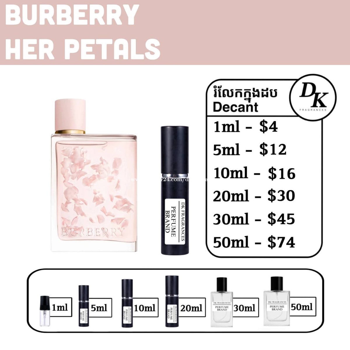 Her petals limited edition by Burberry 88ml full box - $109 រំលែកក្នុងកូនដប/Decant in testing bottles: 1ml, 5ml, 10ml, 20ml, 30ml, 50ml. DK Fragrances គឺធានាលោកអ្នកជាមួយនឹងឥវ៉ាន់សុទ្ធ original 100%។ ជួញដូរដោយក្ដីស្មោះត្រង់។ ខាងខ្ញុំលក់ជា Full box (ដបធំ) និងរំលែកពី ដបធំ ចូលកូនដបសម្រាប់អ្នកចង់តេស្តក្លិន។ មិចបានតម្លៃធូរជាងក្នុងហាង? ដោយសារតែឥវ៉ាន់ ខាងខ្ញុំយកស្តុកចូលច្រើនៗ បានតម្លៃល្អហើយក៏ឲ្យអ្នកទិញបានតម្លៃល្អដូចគ្នា។ ទំនាក់ទំនងតាម Telegram: 011841xxxClick To Call Telegram channel: https://t.me/dkfragrancess ពត៌មានបន្ថែមអាចឆែកគេហទំព័រយើងខ្ញុំ: https://shoplinks.to/dkfragrances Note: DK Fragrances is an online-based original perfume discounter in Phnom Penh, Cambodia. We sell perfumes as in Full bottle (the original bottle), and decants (original perfume liquid extracted from big bottle and transferred to vials for testing purposes). We’ve executed thousands of successful sales—check out our Instagram to see real reviews and feedback from customers. Contact us on Telegram, or visit our website. Telegram channel: https://t.me/dkfragrancess Our website: https://shoplinks.to/dkfragrances
