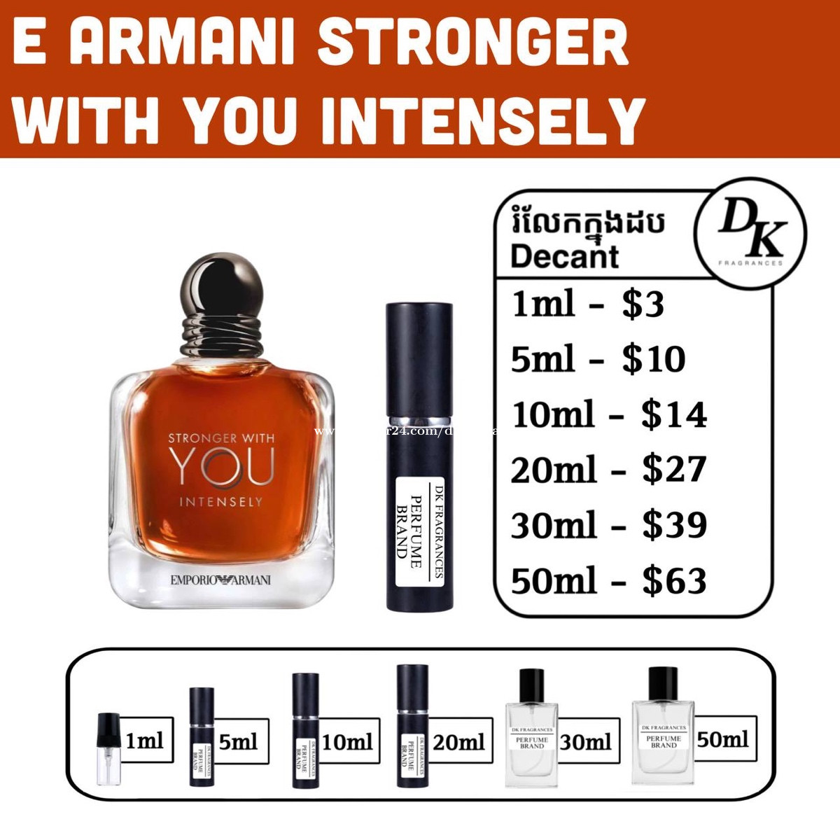 Stronger with you intensely by Armani 100ml full box - $99 ➡️ រំលែកក្នុងកូនដប/Decant in testing bottles: 1ml, 5ml, 10ml, 20ml, 30ml, 50ml. ☑️ DK Fragrances ធានាលោកអ្នកជាមួយនឹងឥវ៉ាន់សុទ្ធ original។ ជួញដូរដោយក្ដីស្មោះត្រង់។ ខាងខ្ញុំលក់ជា Full box (ដបធំ) និងរំលែកពី ដបធំ ចូលកូនដបសម្រាប់អ្នកចង់តេស្តក្លិន។ 📥 ទំនាក់ទំនងតាម Telegram: 011841xxxClick To Call Telegram channel: https://t.me/dkfragrancess ➡️ពត៌មានបន្ថែមអាចឆែកគេហទំព័រយើងខ្ញុំ: https://shoplinks.to/dkfragrances ✅ Note: DK Fragrances is an original perfume discounter in Phnom Penh, Cambodia (Established in 2024). ✅ We sell perfumes as in Full bottle (the original bottle), and decants (original perfume liquid extracted from big bottle and transferred to vials for testing purposes). ✅ We’ve executed thousands of successful sales—check out our Instagram/Tiktok to see real reviews and feedbacks from customers. 📥 Contact us on Telegram, or visit our website. Telegram channel: https://t.me/dkfragrancess Our website: https://shoplinks.to/dkfragrances ‼️ Why should I buy from DK Fragrances? - Guaranteed original products with good prices. - We ship all around Cambodia, with low shipping fees. - We allow Cash-on-Delivery service for Phnom Penh customers - Still don’t trust us? Visit our store directly in Phnom Penh! (See above for details). 🤔 FAQ (frequently asked questions) What is a tester box? A: It’s a simple version of a full box, different from what you see at the store. It usually comes in a plain white or cardboard box and is mainly used by perfume stores as a ‘tester’—that’s where the name comes from. However, there is no difference from any other original perfume; the juice is the same. What is a decant? A: A decant refers to a small testing vial or bottle. When customers want to try a perfume, we also sell it as a ‘decant’—from 1ml up to 50ml. We extract the juice from the original bottle using a syringe and transfer it into our own premium decant bottles. Decants are perfect for customers who want to test a fragrance without buying a full-size bottle.