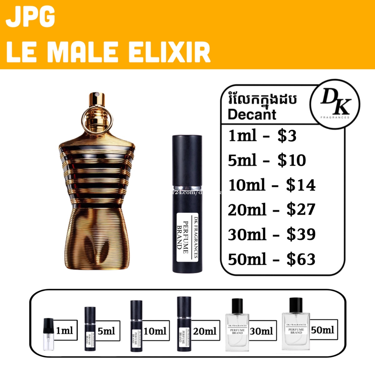 JPG le male elixir 125ml full box - $115 រំលែកក្នុងកូនដប/Decant in testing bottles: 1ml, 5ml, 10ml, 20ml, 30ml, 50ml. DK Fragrances គឺធានាលោកអ្នកជាមួយនឹងឥវ៉ាន់សុទ្ធ original 100%។ ជួញដូរដោយក្ដីស្មោះត្រង់។ ខាងខ្ញុំលក់ជា Full box (ដបធំ) និងរំលែកពី ដបធំ ចូលកូនដបសម្រាប់អ្នកចង់តេស្តក្លិន។ មិចបានតម្លៃធូរជាងក្នុងហាង? ដោយសារតែឥវ៉ាន់ ខាងខ្ញុំយកស្តុកចូលច្រើនៗ បានតម្លៃល្អហើយក៏ឲ្យអ្នកទិញបានតម្លៃល្អដូចគ្នា។ ទំនាក់ទំនងតាម Telegram: 011841xxxClick To Call Telegram channel: https://t.me/dkfragrancess ពត៌មានបន្ថែមអាចឆែកគេហទំព័រយើងខ្ញុំ: https://shoplinks.to/dkfragrances Note: DK Fragrances is an online-based original perfume discounter in Phnom Penh, Cambodia (Est. 2024). We sell perfumes as in Full bottle (the original bottle), and decants (original perfume liquid extracted from big bottle and transferred to vials for testing purposes). We’ve executed thousands of successful sales—check out our Instagram to see real reviews and feedback from customers. Contact us on Telegram, or visit our website. Telegram channel: https://t.me/dkfragrancess Our website: https://shoplinks.to/dkfragrances FAQ (frequently asked questions) What is a tester box? A: It’s a simple version of a full box, different from what you see at the store. It usually comes in a plain white or cardboard box and is mainly used by perfume stores as a ‘tester’—that’s where the name comes from. However, there is no difference from any other original perfume; the juice is the same. What is a decant? A: A decant refers to a small testing vial or bottle. When customers want to try a perfume, we also sell it as a ‘decant’—from 1ml up to 50ml. We extract the juice from the original bottle using a syringe and transfer it into our own premium decant bottles. Decants are perfect for customers who want to test a fragrance without buying a full-size bottle.