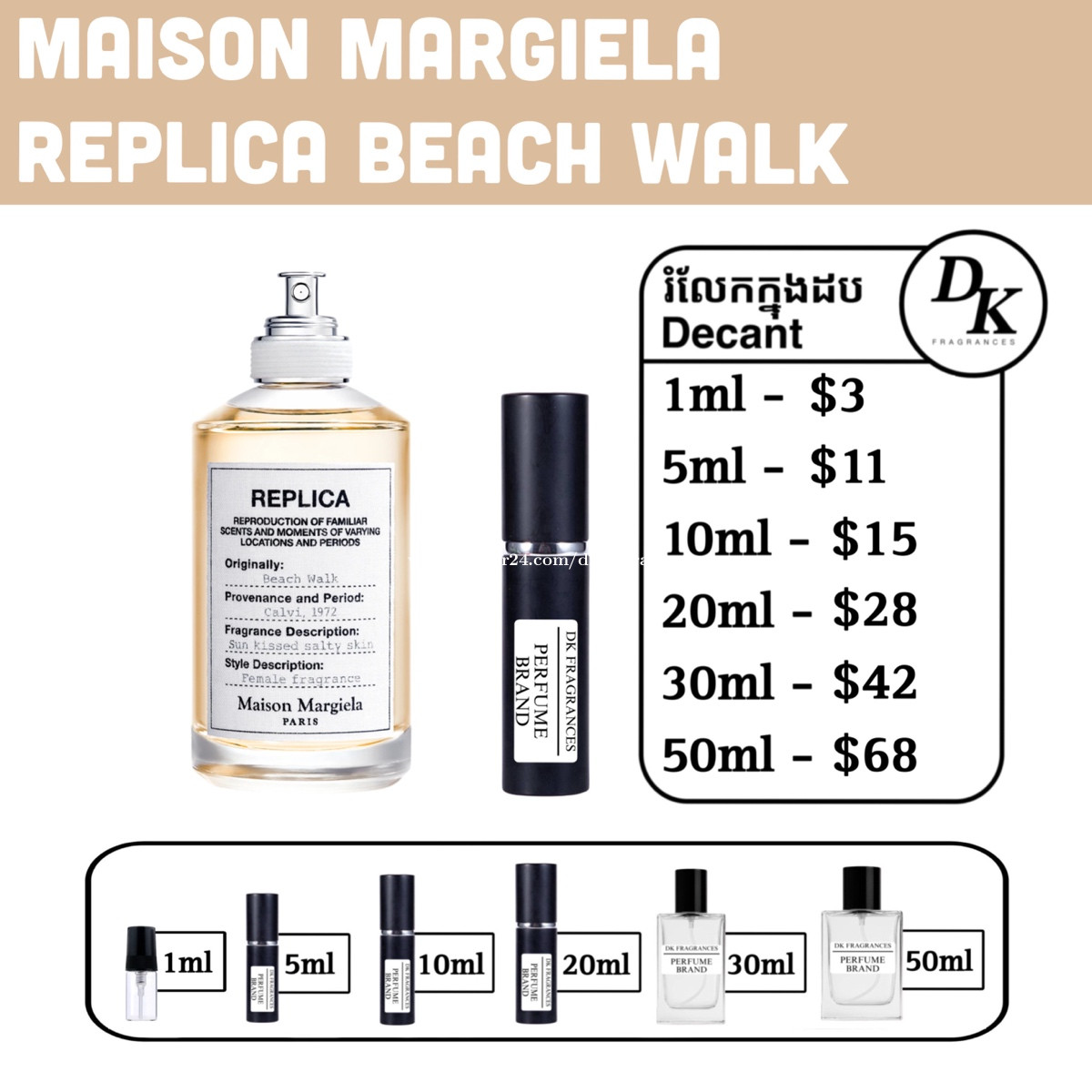 Beach walk: 100ml full box - $99 រំលែកក្នុងកូនដប/Decant in testing bottles: 1ml, 5ml, 10ml, 20ml, 30ml, 50ml. DK Fragrances គឺធានាលោកអ្នកជាមួយនឹងឥវ៉ាន់សុទ្ធ original 100%។ ជួញដូរដោយក្ដីស្មោះត្រង់។ ខាងខ្ញុំលក់ជា Full box (ដបធំ) និងរំលែកពី ដបធំ ចូលកូនដបសម្រាប់អ្នកចង់តេស្តក្លិន។ មិចបានតម្លៃធូរជាងក្នុងហាង? ដោយសារតែឥវ៉ាន់ ខាងខ្ញុំយកស្តុកចូលច្រើនៗ បានតម្លៃល្អហើយក៏ឲ្យអ្នកទិញបានតម្លៃល្អដូចគ្នា។ ទំនាក់ទំនងតាម Telegram: 011841xxxClick To Call Telegram channel: https://t.me/dkfragrancess ពត៌មានបន្ថែមអាចឆែកគេហទំព័រយើងខ្ញុំ: https://shoplinks.to/dkfragrances Note: DK Fragrances is an online-based original perfume discounter in Phnom Penh, Cambodia (Est. 2024). We sell perfumes as in Full bottle (the original bottle), and decants (original perfume liquid extracted from big bottle and transferred to vials for testing purposes). We’ve executed thousands of successful sales—check out our Instagram to see real reviews and feedback from customers. Contact us on Telegram, or visit our website. Telegram channel: https://t.me/dkfragrancess Our website: https://shoplinks.to/dkfragrances FAQ (frequently asked questions) What is a tester box? A: It’s a simple version of a full box, different from what you see at the store. It usually comes in a plain white or cardboard box and is mainly used by perfume stores as a ‘tester’—that’s where the name comes from. However, there is no difference from any other original perfume; the juice is the same. What is a decant? A: A decant refers to a small testing vial or bottle. When customers want to try a perfume, we also sell it as a ‘decant’—from 1ml up to 50ml. We extract the juice from the original bottle using a syringe and transfer it into our own premium decant bottles. Decants are perfect for customers who want to test a fragrance without buying a full-size bottle.