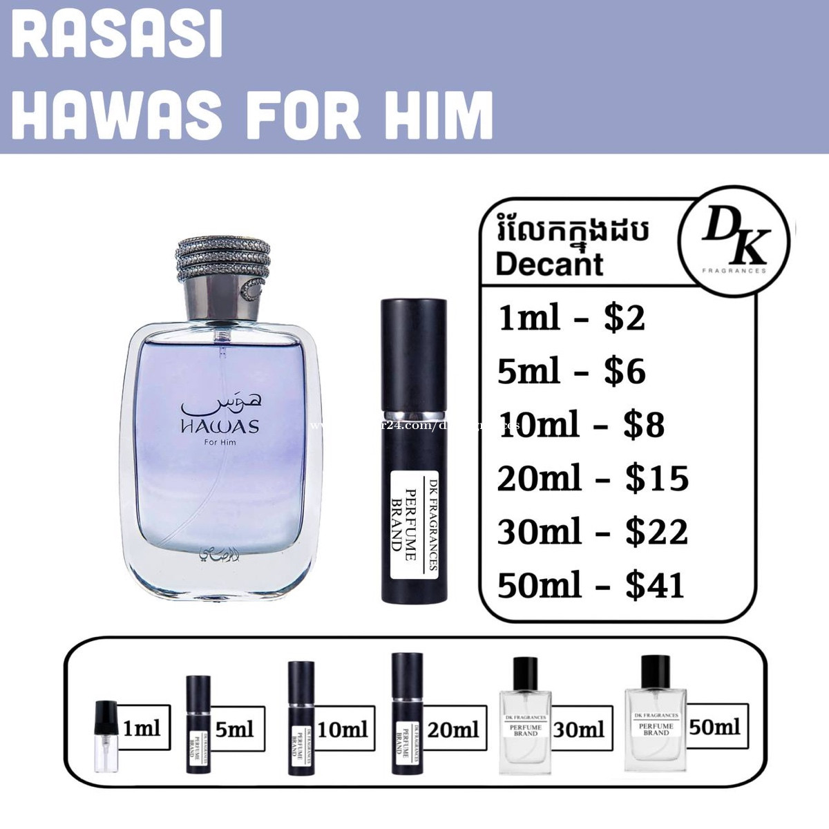 Rasasi hawas for him 100ml full box - $55 រំលែកក្នុងកូនដប/Decant in testing bottles: 1ml, 5ml, 10ml, 20ml, 30ml, 50ml. DK Fragrances គឺធានាលោកអ្នកជាមួយនឹងឥវ៉ាន់សុទ្ធ original 100%។ ជួញដូរដោយក្ដីស្មោះត្រង់។ ខាងខ្ញុំលក់ជា Full box (ដបធំ) និងរំលែកពី ដបធំ ចូលកូនដបសម្រាប់អ្នកចង់តេស្តក្លិន។ មិចបានតម្លៃធូរជាងក្នុងហាង? ដោយសារតែឥវ៉ាន់ ខាងខ្ញុំយកស្តុកចូលច្រើនៗ បានតម្លៃល្អហើយក៏ឲ្យអ្នកទិញបានតម្លៃល្អដូចគ្នា។ ទំនាក់ទំនងតាម Telegram: 011841xxxClick To Call Telegram channel: https://t.me/dkfragrancess ពត៌មានបន្ថែមអាចឆែកគេហទំព័រយើងខ្ញុំ: https://shoplinks.to/dkfragrances Note: DK Fragrances is an online-based original perfume discounter in Phnom Penh, Cambodia (Est. 2024). We sell perfumes as in Full bottle (the original bottle), and decants (original perfume liquid extracted from big bottle and transferred to vials for testing purposes). We’ve executed thousands of successful sales—check out our Instagram to see real reviews and feedback from customers. Contact us on Telegram, or visit our website. Telegram channel: https://t.me/dkfragrancess Our website: https://shoplinks.to/dkfragrances