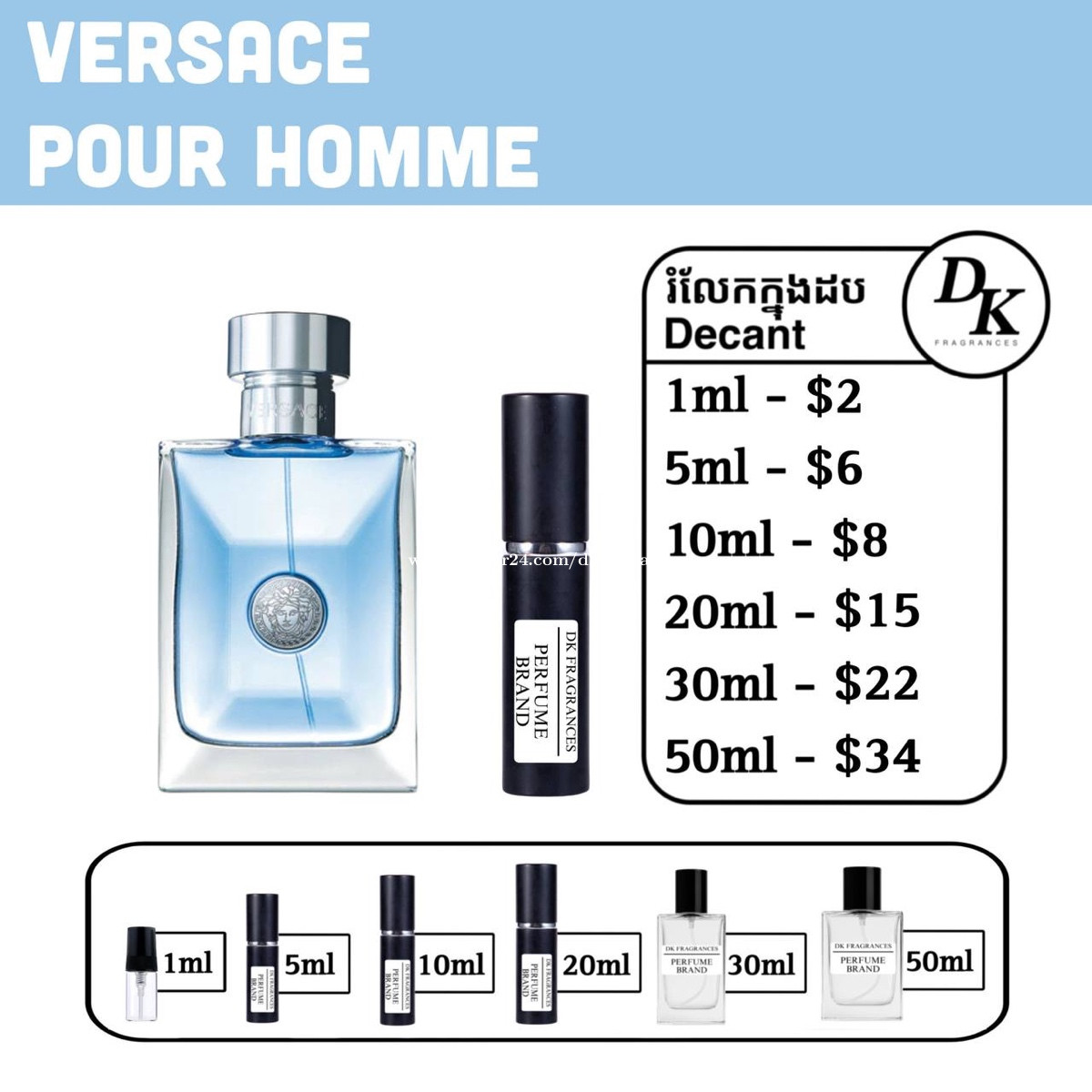 Versace pour homme 100ml full box - $65 100ml tester box - $49 200ml full box - $89 រំលែកក្នុងកូនដប/Decant in testing bottles: 1ml, 5ml, 10ml, 20ml, 30ml, 50ml. DK Fragrances គឺធានាលោកអ្នកជាមួយនឹងឥវ៉ាន់សុទ្ធ original 100%។ ជួញដូរដោយក្ដីស្មោះត្រង់។ ខាងខ្ញុំលក់ជា Full box (ដបធំ) និងរំលែកពី ដបធំ ចូលកូនដបសម្រាប់អ្នកចង់តេស្តក្លិន។ មិចបានតម្លៃធូរជាងក្នុងហាង? ដោយសារតែឥវ៉ាន់ ខាងខ្ញុំយកស្តុកចូលច្រើនៗ បានតម្លៃល្អហើយក៏ឲ្យអ្នកទិញបានតម្លៃល្អដូចគ្នា។ Telegram channel: https://t.me/dkfragrancess ពត៌មានបន្ថែមអាចឆែកគេហទំព័រយើងខ្ញុំ: https://shoplinks.to/dkfragrances Note: DK Fragrances is an online-based original perfume discounter in Phnom Penh, Cambodia. We sell perfumes as in Full bottle (the original bottle), and decants (original perfume liquid extracted from big bottle and transferred to vials for testing purposes). We’ve executed thousands of successful sales—check out our Instagram to see real reviews and feedback from customers. Telegram channel: https://t.me/dkfragrancess Our website: https://shoplinks.to/dkfragrances