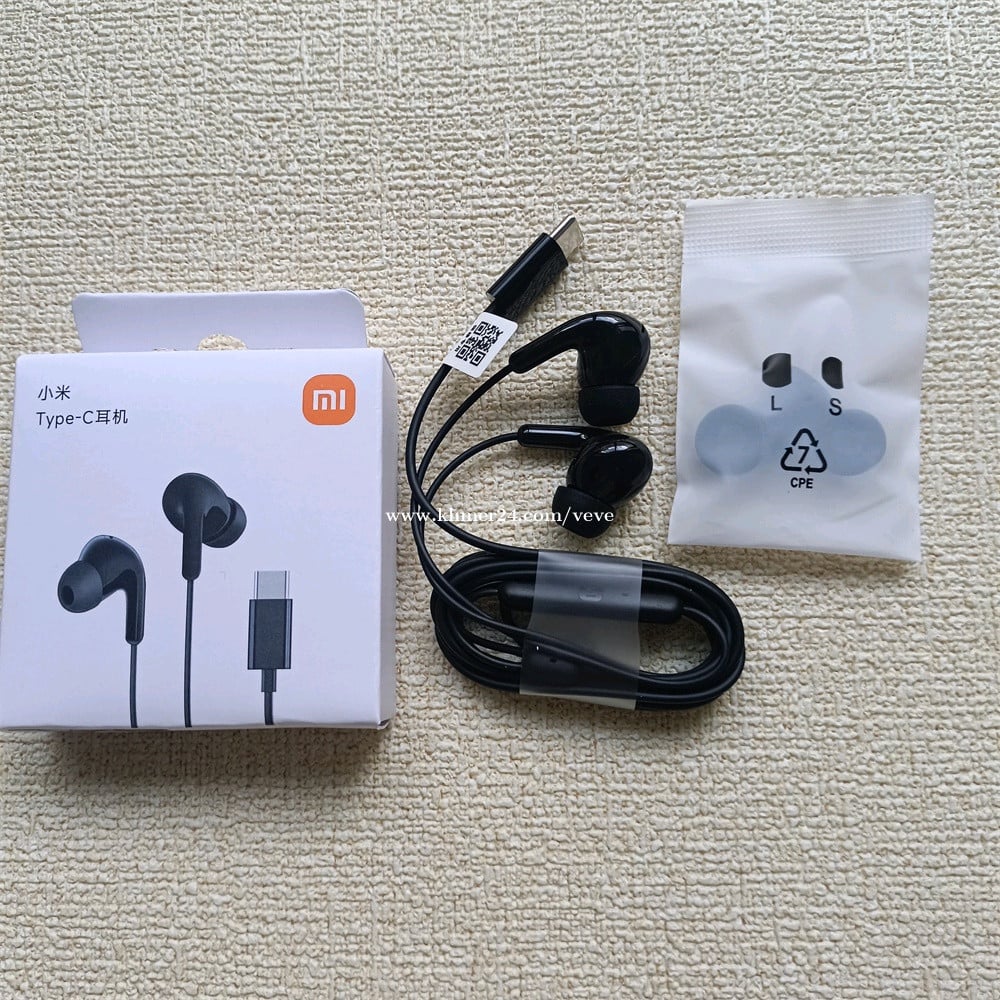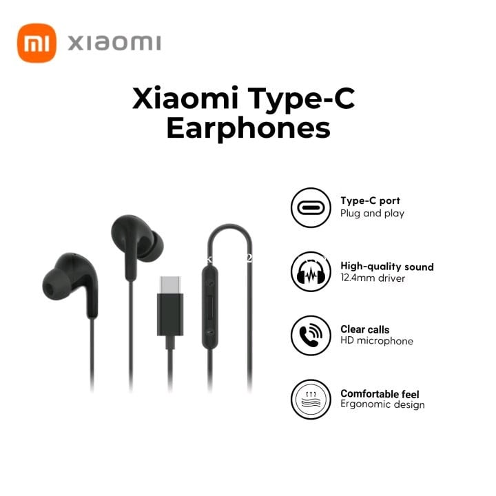 This is a retail box for the Xiaomi Type-C Earphones. Key features of the product include: 12.4mm large drivers for high-quality audio. HD microphone with digital noise cancellation for clear calls. Ergonomic design for comfortable fit during prolonged use. IP54 dust and water resistance.
