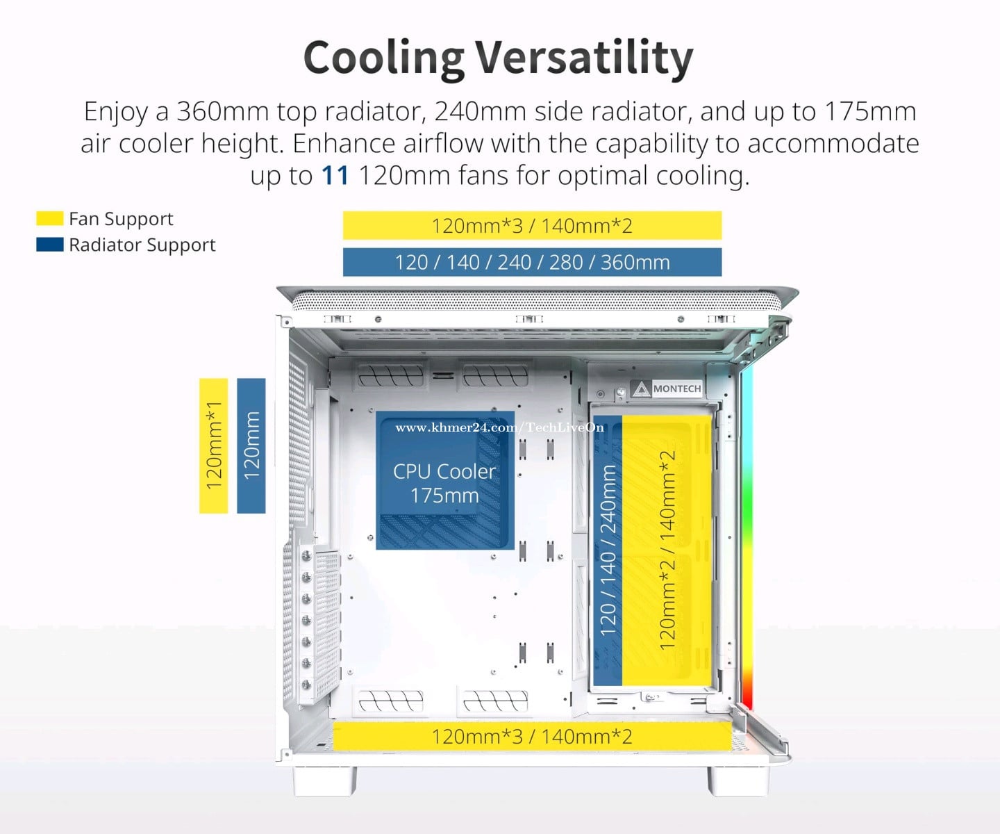 មាន Fan Montech 6 គ្រាប់ និង Fan Controller Hub មកស្រាប់ជាមួយ Case Motherboard Support: អាចដាក់ Motherboard ប្រភេទ ATX / Micro-ATX / Mini-ITX GPU Support: 420mm ( អាចដាក់បានដល់ទៅ RTX 5090) Condition: ថ្មីប្រអប់ (New Box) Location: ភ្នំពេញ Telegram: https://t.me/TechLiveOn Phone Number: 086837xxxClick To Call / 0968115xxxClick To Call