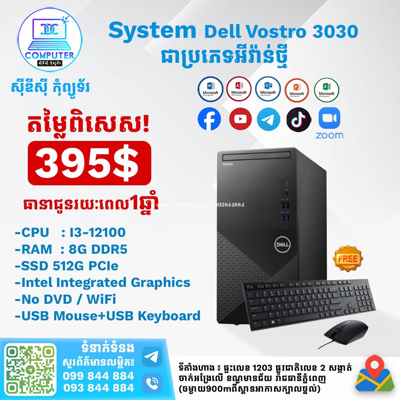 System Dell Vostro 3030 New in box 100% CPU i3-12100 ( ជំនាន់ទី 12 ) Ram 8GB DDR5 M.2 PCIe 512GB VGA Intel Integrated Graphics No DVD Have Wifi (USB Mouse+USB Keyboard) Price 395$ CDC COMPUTER 🖥 ☎️ ទូរស័ព្ទលេខ : 093844xxxClick To Call / 099844xxxClick To Call Telegram : t.me/CDCCOMPUTER093 🏠 ទីតាំងហាង : ផ្ទះលេខ 1203 ផ្លូវជាតិលេខ2 ចាក់អង្រែលើ ខ័ណ្ឌមានជ័យ ភ្នំពេញ (ចំងាយពីស្ពានអាកាសក្បាលថ្នល់ 900ម៉ែត្រ) 📍 Google map : https://maps.app.goo.gl/R3W9thPP5omgsMaZA