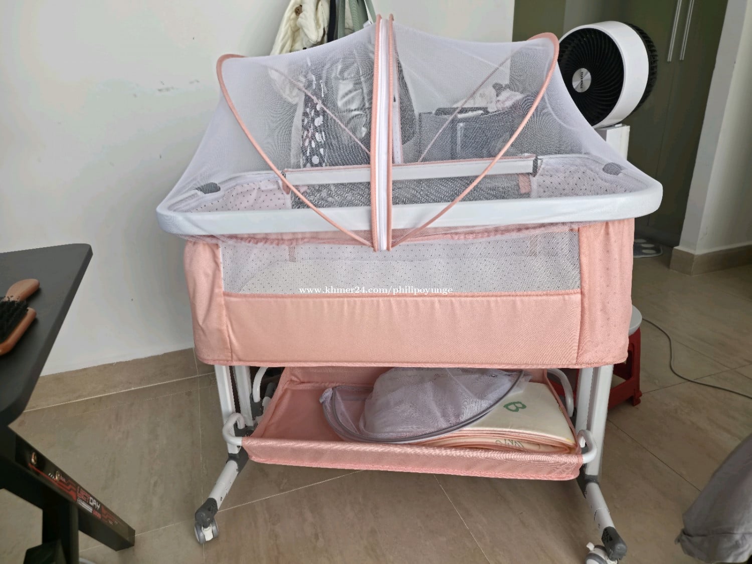 This is a portable, foldable baby bassinet. Features a full-cover mosquito net to protect the baby from insects. Equipped with lockable wheels for mobility and stability. Includes a storage area beneath the bassinet for baby essentials.