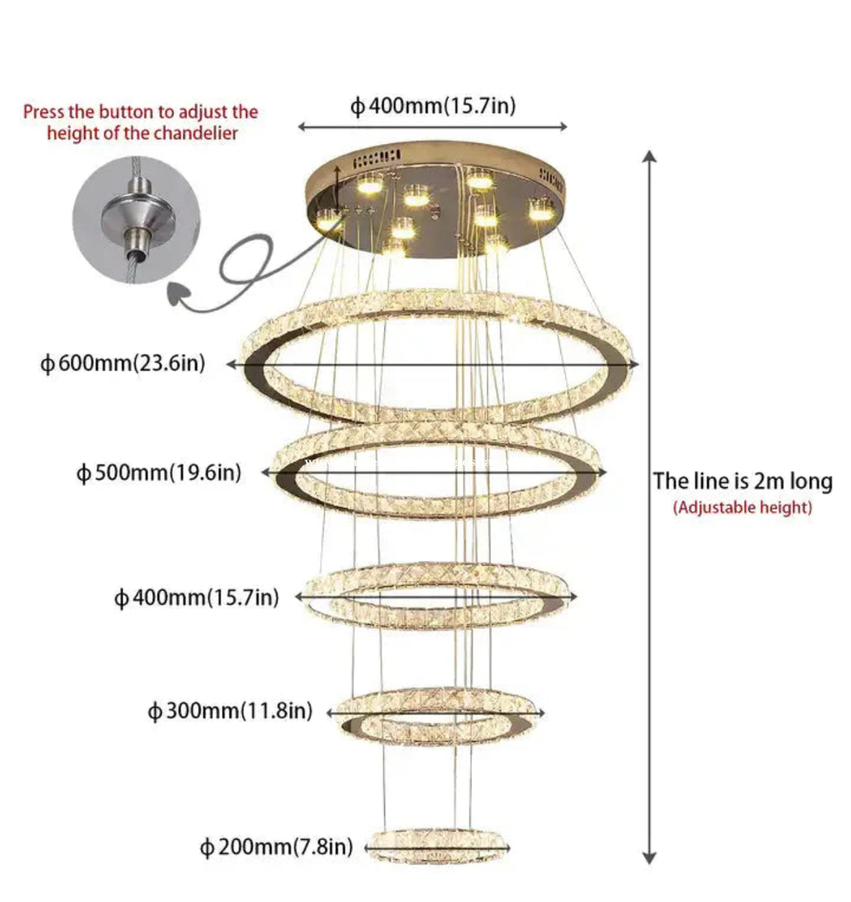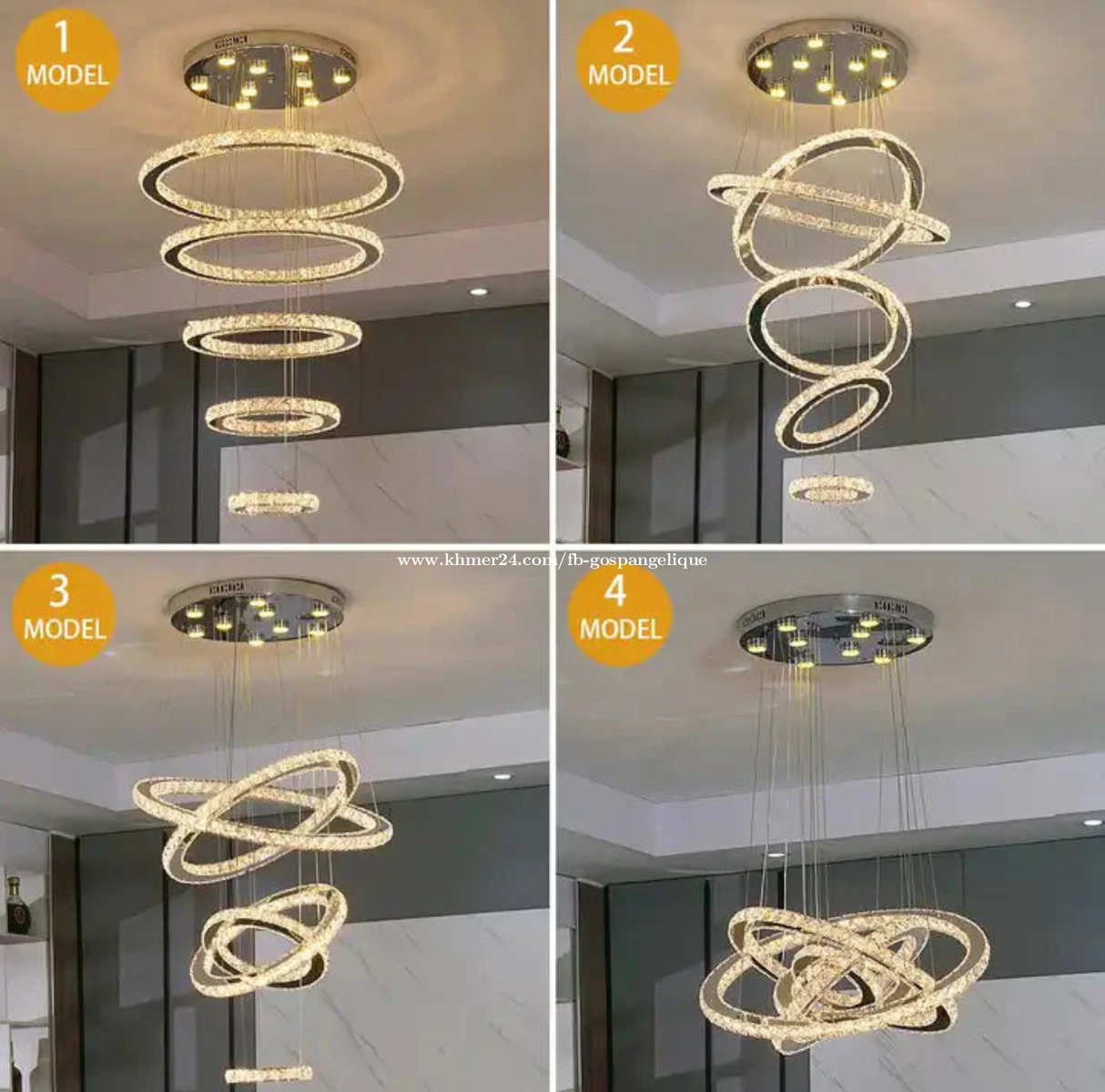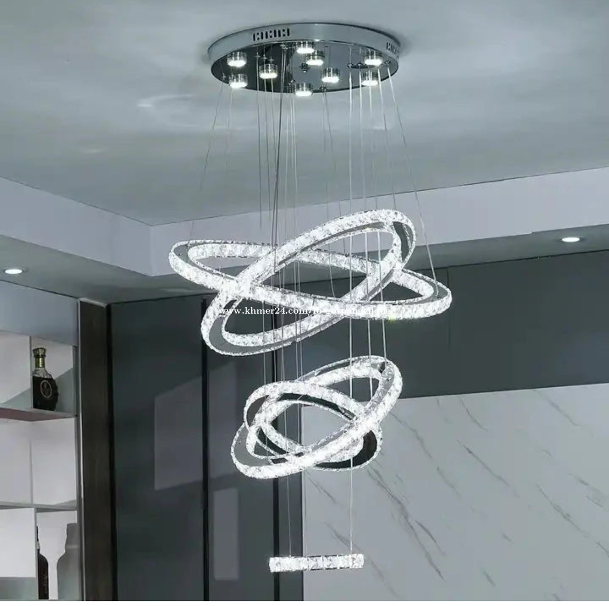 Model Number: HQ-23456-SS Bring modern luxury into your home with this elegant 5-ring LED chandelier from AL OSTOURA. Designed to enhance high-end interiors, it offers bright illumination, premium crystal finishing, and a stunning spiral 3D effect. Impressive floating ring design Top-grade crystal reflections Elegant chrome finish Durable & long-life LED Excellent brightness performance Lamp Rings: 60 + 50 + 40 + 30 + 20 cm Product weight: 9.5 kg