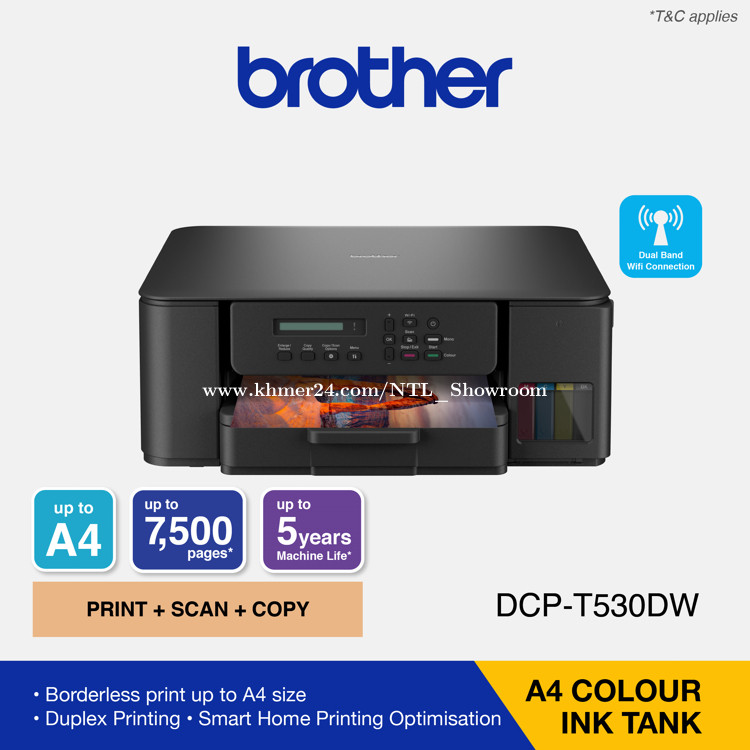 * Brother DCP-T530DW 3-in-1 A4 * Colour Ink Tank Printer, Print, Scan, Copy, Duplex, USB, WiFi * Up to 16 ipm print Speed, Up to 150 sheets Maximum paper capacity, Up to 1200x6000 dpi Resolution, 2-sided Duplex printing, Up to 150 sheets Tray, 1 sheet manual feed slot, Up to 99 pages multiple copies, Colour / Monochrome Scan, Up to 1200x2400 dpi Resolution - Scanner Glass, Hi-Speed USB 2.0, WiFi, 1 line LCD (16 characters) Display