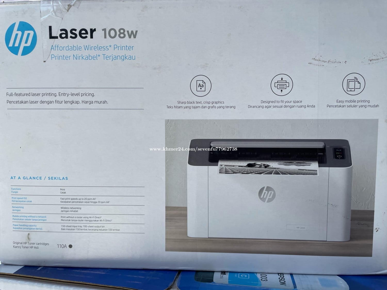 ✅ មុខងារសំខាន់ៗ HP Laser 108w • 🖨️ បោះពុម្ព Laser (Black & White) • បោះពុម្ពតែ ពណ៌ខ្មៅ/ស (Monochrome) សម្រាប់ឯកសារ • ⚡ បោះពុម្ពលឿន • ល្បឿនប្រហែល 20 ទំព័រ/នាទី (A4) • 📶 Wi-Fi / Wireless Printing • អាចភ្ជាប់ Wi-Fi បោះពុម្ពដោយមិនចាំបាច់ខ្សែ • 📱 Mobile Printing • អាចបោះពុម្ពពី ទូរស័ព្ទ (Android/iPhone) ងាយស្រួល • 🔗 Wi-Fi Direct • អាចភ្ជាប់ទូរស័ព្ទទៅម៉ាស៊ីនបោះពុម្ពផ្ទាល់ ដោយមិនចាំបាច់មាន Router/Internet • 🧾 គុណភាពបោះពុម្ពច្បាស់ • អក្សរច្បាស់ សម្រាប់ការងារការិយាល័យ/សាលារៀន • 📄 ថាសដាក់ក្រដាស (Input Tray) • ដាក់ក្រដាសបានប្រហែល 150 សន្លឹក • Output ប្រហែល 100 សន្លឹក • 🖊️ ប្រើទឹកหมึก HP 110A • ទឹកหมึก Laser ងាយរក និងប្រើបានយូរ ✅ សាកសមសម្រាប់ • ការិយាល័យ / ហាង / សាលារៀន • បោះពុម្ពឯកសារ Word, PDF, Invoice, Report