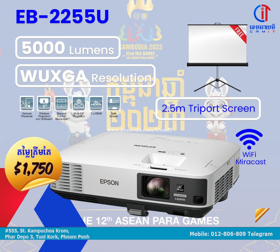 Brand New 3LCD Projector Epson EB-2255U -Projection Technology: 3LCD -Resolution: 1920 x 1200(WUXGA) -Brightness: 5,000 ANSI Lumens -Lamp Life: 5,000 hours normal -Contract Ratio: 15,000:1 -Screen size: 50 - 300 inch -Built-In Speaker: 16W Monaural -Weight: 4.7kg -Warranty: 1 year _____________________________ 555, ផ្លូវកម្ពុជាក្រោម ខាងកើតស្តុបសន្ធរម៉ុក៧០ម៉ែត្រ 012806xxxClick To Call telegram https://goo.gl/maps/GaCz94s6snSDZQBc8