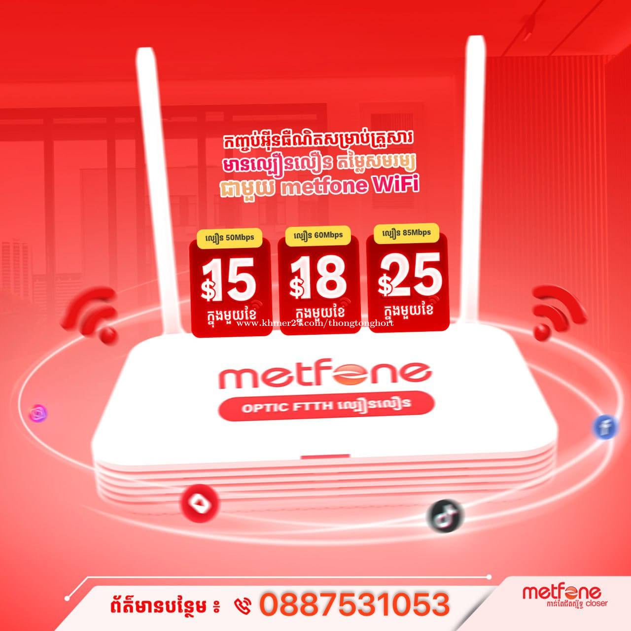 ๐กSpecial promotion from Metfone WiFi ๐ถ No more slow internet. Stay connected with strong WiFi that keeps up with your lifestyle. โจ Monthly Packages Available: ๐ธ $15/month โ 50 Mbps ๐ธ $18/month โ 60 Mbps ๐ธ $25/month โ 85 Mbps ๐ธ $35/month โ 120 Mbps ๐ก Why Customers Choose Us: โ Fast installation within 24 hours โ Stable connection, no interruptions โ No deposit required โ Free router loan โ Installation available in all provinces/cities โ Free SIM2 (5GB data internet + 200 call minutes) every month ๐ฒ Register Now! ๐ WhatsApp: +855887531053 ๐Telegram: https://t.me/Internet_WiFi_Optic ๐ Quick installation, service to your location ๐ถ Good service, stable network 24/7