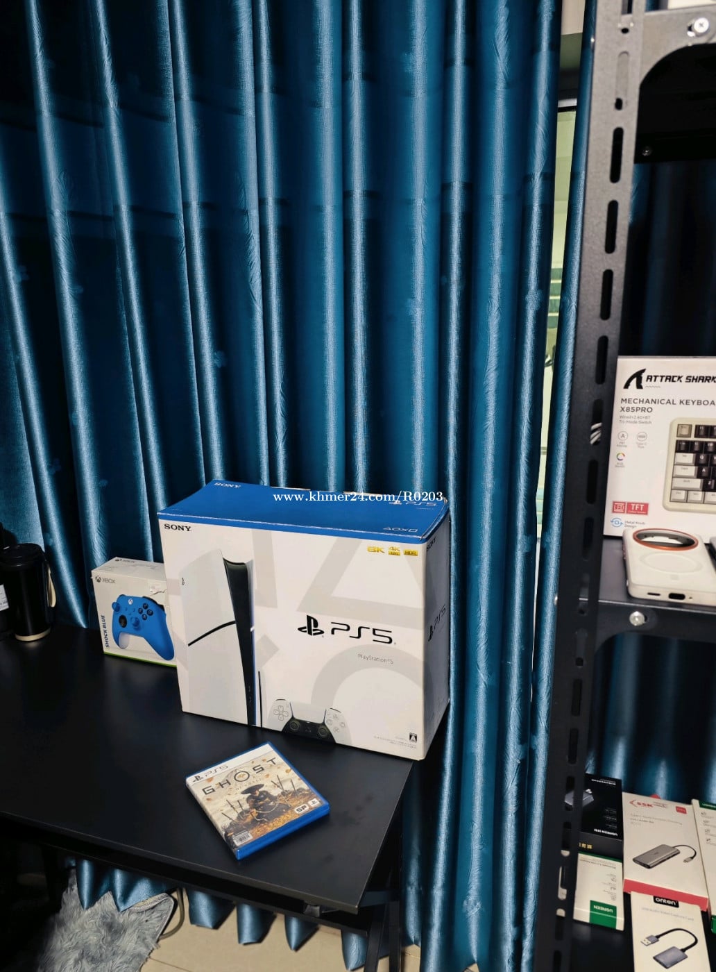 PS5 slim full box + Ghost Of Yuti នៅថ្មីស្អាតដំណើរការល្អ។