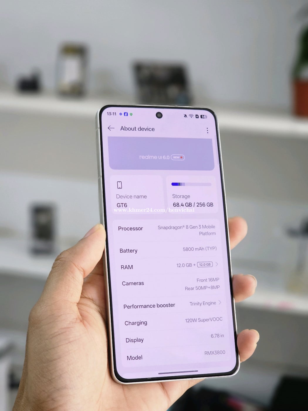 realme GT6 ម៉ាស៊ីនខ្លាំង smooth chip Snapdragon 8 gen 3 អេក្រង់ LTPO 120HZ ថ្មធំ 5800 សាក 120 wat camera ច្បាស់
