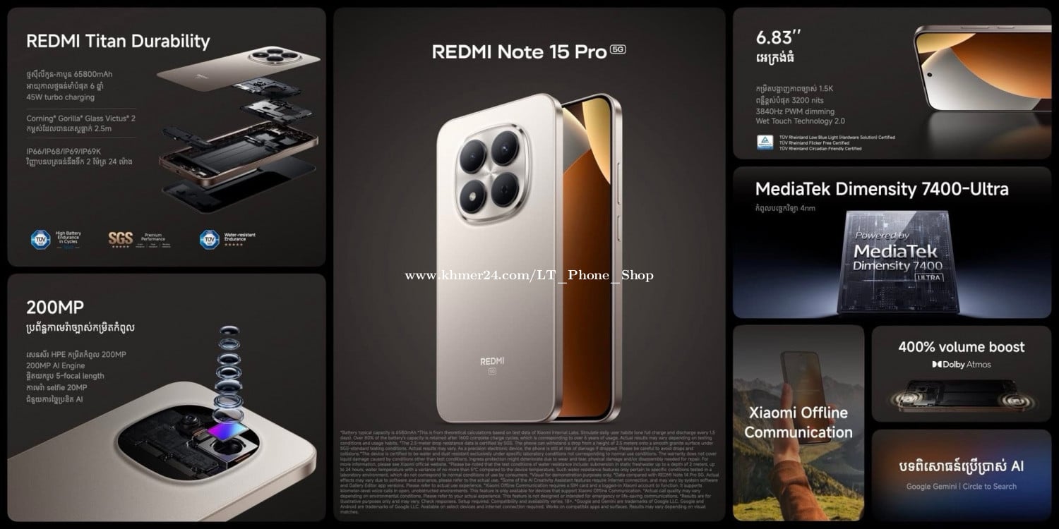 💎REDMINote15Pro5G មកព្រមនឹងមុខងារអ៊េមជាច្រើន🪨💦🔨 👑Ram 8GB+8GB/Memory 256GB តំលៃពេញ 309$ បញ្ចុះតំលៃនៅសល់ត្រឹម 290$ តែប៉ុណ្ណោះ 👑Ram 12GB+12GB/Memory 512GB តំលៃពេញ 369$ បញ្ចុះតំលៃនៅសល់ត្រឹម 350$ តែប៉ុណ្ណោះ ✔️ធន់នឹងការធ្លាក់កម្ពស់ 2.5 ម៉ែត្រ តាមស្តង់ដារ SGS ✔️ធន់នឹងទឹក IP69K បានដល់ជម្រៅ 2 ម៉ែត្រ ក្នុងរយៈពេលរហូតដល់ 24 ម៉ោង ✔️កាមេរ៉ា 200MP ច្បាស់លម្អិត គ្រប់ទស្សនីយភាព ✔️មាន3ពណ៍: ខ្មៅ, មាស, និងស្វាយ ✔️មានធានារយះពេល1ឆ្នាំ 🏡 ហាងលក់ទូរស័ព្ទដៃទំនើប អិលធី 📲 ទំនាក់ទំនងលេខទូរស័ព្ទ: 016711xxxClick To Call (Telegram) / 099333xxxClick To Call / 0888884xxxClick To Call 📩 Telegram: https://t.me/LTPhoneShop 📬 Facebook Page: https://www.facebook.com/share/165XEwR2ZA/?mibextid=wwXIfr 🗺️ ផ្ទះលេខ139c, ផ្លូវលេខ143 កែងផ្លូវលេខ376, សង្កាត់បឹងកេងកង3, ខណ្ឌបឹងកេងកង, រាជធានីភ្នំពេញ 📍Google map: https://maps.app.goo.gl/phENGCSAT33SaM9r7?g_st=com.google.maps.preview.copy 🛵 មានសេវាដឹកជញ្ជូនគ្រប់ខេត្តក្រុងរាជធានី