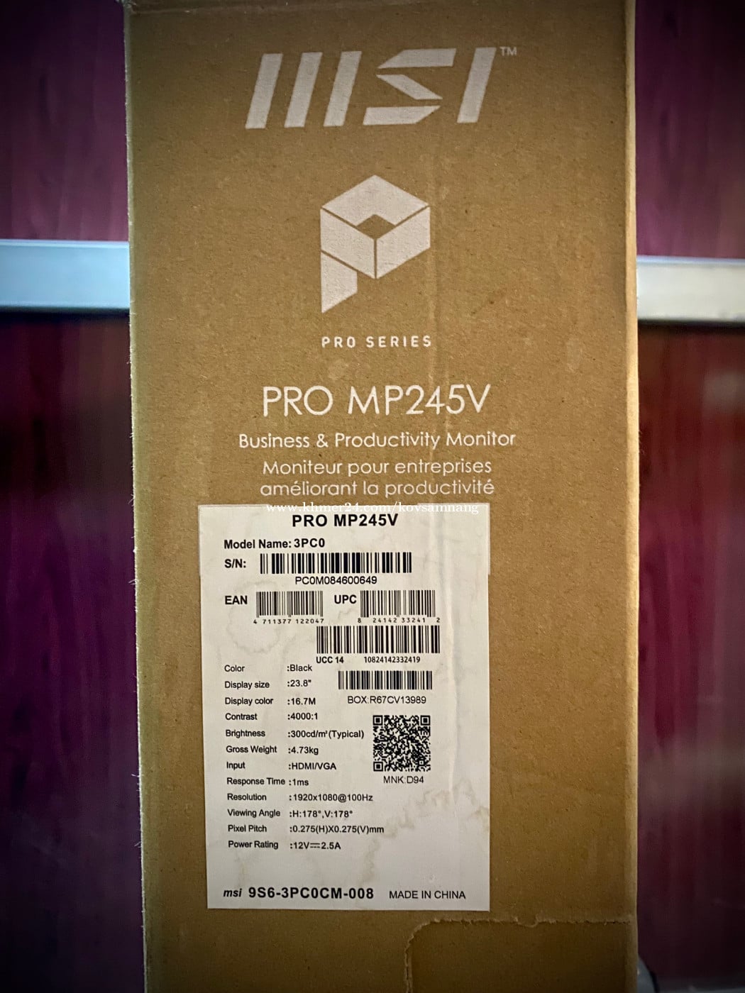 MSI Pro MP245V Model Name:3PC0 Color:Black Display Size:23.8" Display color:16.7M Contrast:4000:1 Brightness:300cd/m2(Typical) Grooss Weight:4.73kg Input:HDMI/VGA Response Time:1ms Resolution:1920x1080@100Hz Viewing Angle:H:178o,V:178o Pixel Pitch:0.275(H)X0.275(V)mm Power Rating:12V___2.5A