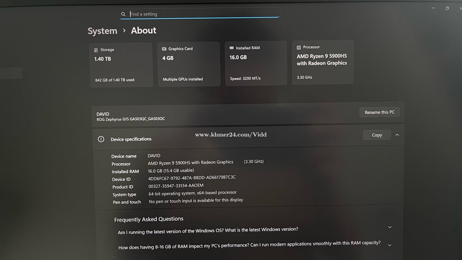 Grade: Minimal Wear (clean, well maintained) Reason: Upgrade / no longer needed CPU: AMD Ryzen 9 5900HS (3.30GHz) RAM: 16GB DDR4 (3200MHz) Storage: 1.4TB Graphics: Nvidia RTX 3050 4GB Display: 15.6” 2k 165hz Keyboard: White Backlit keyboard Performance: Suitable for gaming, graphic design, video editing, programming