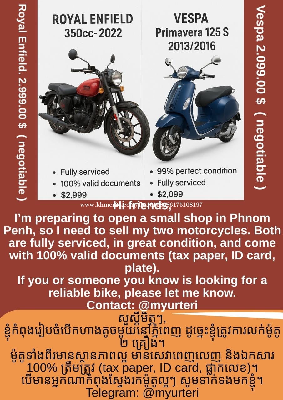សួស្តីមិត្តៗទាំងអស់គ្នា, ខ្ញុំកំពុងរៀបចំបើកហាងតូចមួយនៅភ្នំពេញ ហើយត្រូវការលក់ម៉ូតូពីររបស់ខ្ញុំ។ ម៉ូតូទាំងពីរនេះថែទាំល្អ មានសេវាពេញលេញ និងមាន ឯកសារត្រឹមត្រូវ 100% (tax paper, ID card, ផ្លាកលេខ ពេញលេញ)។ បើមានអ្នកណាម្នាក់ទាមទារ ឬមានមិត្តភក្តិចង់ទិញ សូមជួយជម្រុញម្តង អរគុណច្រើនណាស់ 🙏 ព័ត៌មានបន្ថែម: @myurteri Royal Enfield Meteor 350 ឆ្នាំ 2022 តម្លៃ: $2,999 (អាចចរចា) ចម្ងាយ: ~20,300 km ស្ថានភាព: * ម៉ាស៊ីនដំណើរការល្អបំផុត * ប្តូរ throttle body ថ្មី, ថ្មថ្មី, ប៊ូហ្ស៊ីថ្មី, កន្ទបទ្រាំថ្មី * ប្តូរសារធាតុរាវទាំងអស់ * មានប្រវត្តិសេវាពេញលេញពីមជ្ឈមណ្ឌល Royal Enfield ឯកសារ (សំខាន់ណាស់): * Tax paper ដើម + ផ្លាកលេខ និង ID card មានសុពលភាព 100% * ឯកសារទាំងអស់រួចរាល់ សម្រាប់ការប្ដូរទាន់ចិត្ត ចំណាំ: រូបរាងខាងក្រៅស្អាត មានតែស្នាមប្រើប្រាស់ធម្មតាបន្តិចបន្តួចប៉ុណ្ណោះ។ ទំនាក់ទំនង: @myurteri / +8558788xxxClick To Call5 I’m preparing to open a small shop here in Phnom Penh, so I need to sell my two motorcycles. Both bikes are fully serviced, well-maintained, and come with 100% valid documents (plate, ID card, tax papers, everything complete). If you or someone you know is looking for a reliable bike, your support would mean a lot. For details and photos: @myurteri Thank you 🙏 2022 Royal Enfield Meteor 350 Price: $2,999 (negotiable) Mileage: ~20,300 km Condition: * Mechanically perfect * New throttle body, battery, spark plug, brake pads * Full fluid change (oil, brake fluid, etc.) * Full official Royal Enfield service records available Documents (Very Important): * Original tax papers, plate & ID card all 100% valid * All documents are complete and ready for transfer Note: Overall very clean with normal minor usage marks only. Contact: @myurteri / +8558788xxxClick To Call5