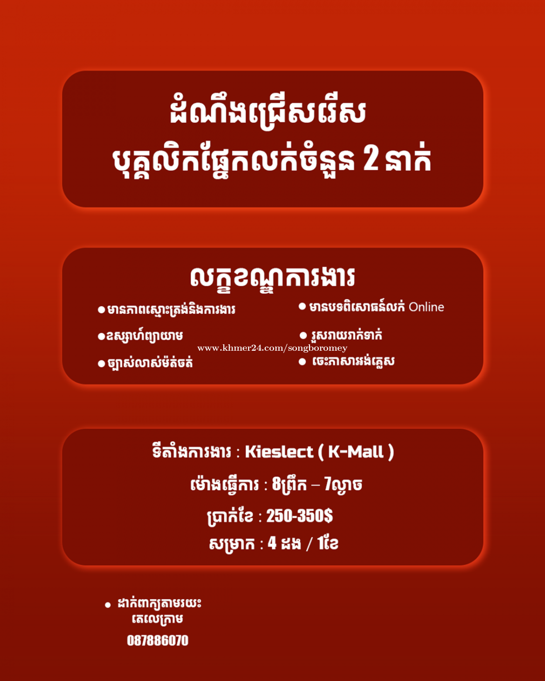 Contact Info: Please don't forget to mention that you found this ad on khmer24.com.