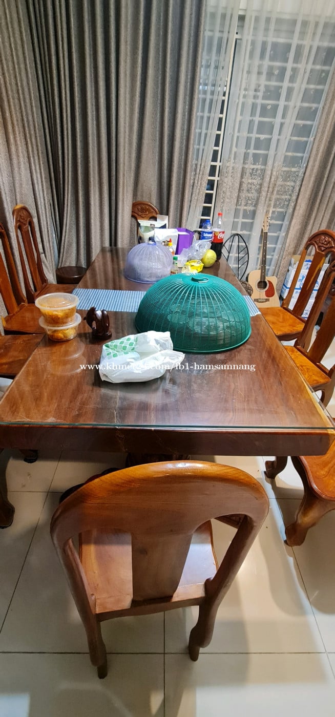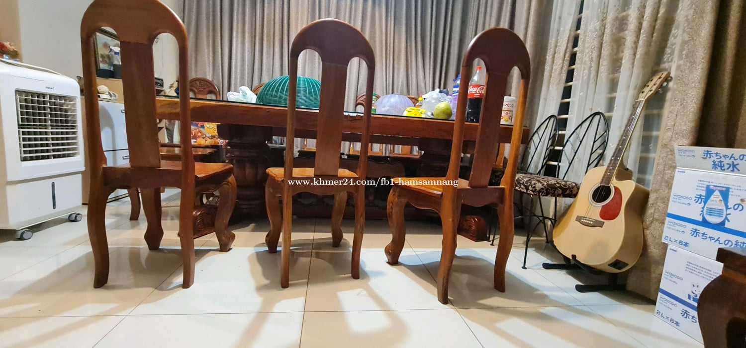 លក់តុឈើបេងទំហំ 218×110×80 cm (LxWxH) មួយសន្លឹកពេញមិនត (កំរាស់ 10 cm) + កៅអីឈើបេង 10 កៅអី និងថែមកញ្ចក់ក្រាលពីលើកំរាស់ 10លី។