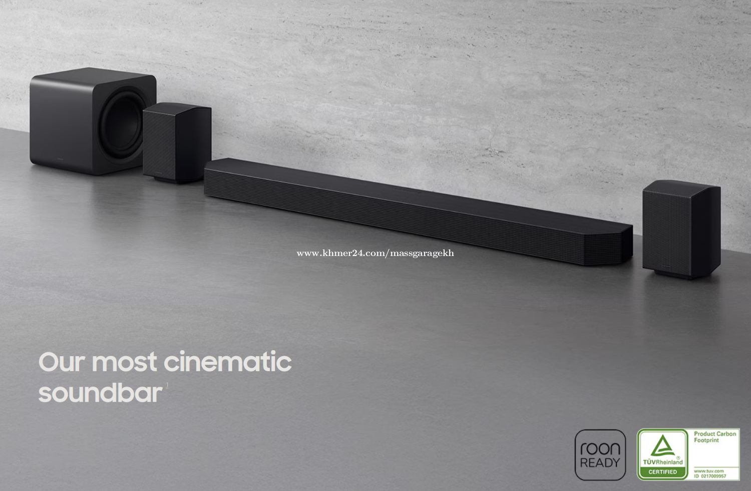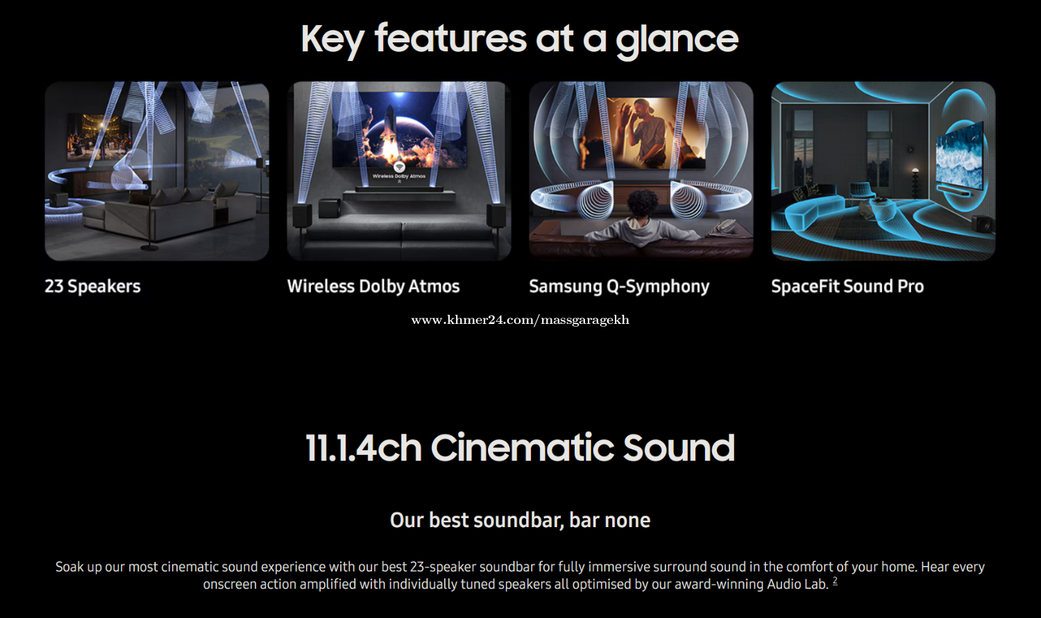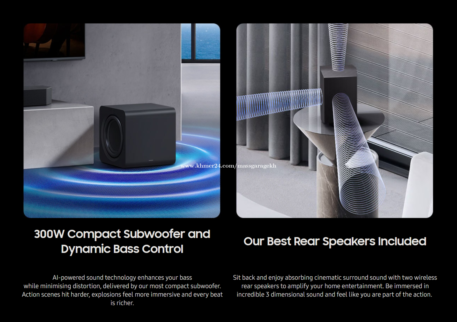120Hz 4K Pass Through Perfect for PS5 Pro True 11.1.4ch Full Surround 23 speakers Dual 8 Inch AI Subwoofer Wireless Dolby Atmos Next level wireless immersive sound Samsung Q-Symphony SpaceFit Sound Pro Active Voice Amplifier Pro HDMI 2.1 eARC
