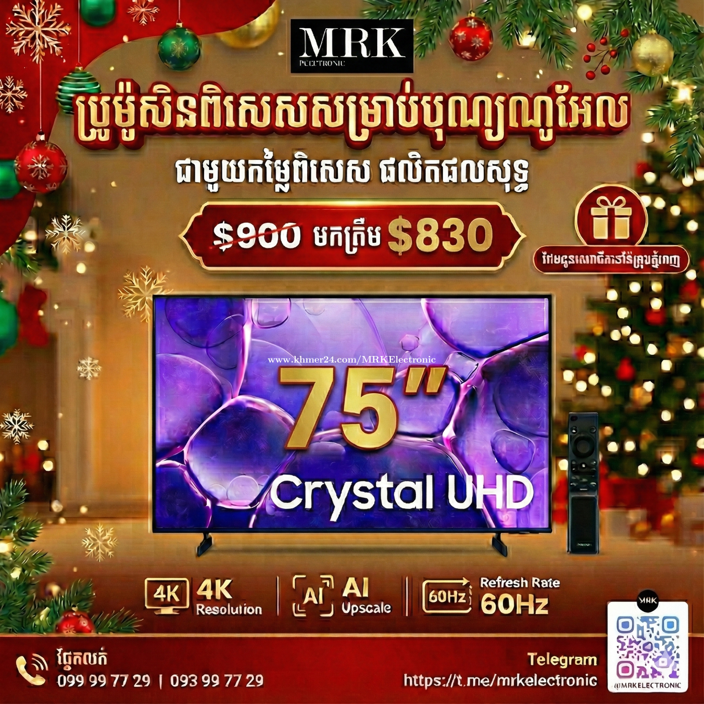 🎄 ប្រូម៉ូសិនបុណ្យណូអែល! TV 4K (AI Upscale) បញ្ចុះតម្លៃពិសេសសល់ត្រឹម $530 ការពិពណ៌នា (Description) 🎄 ប្រូម៉ូសិនពិសេសអបអរសាទរបុណ្យណូអែល! (Christmas Special Offer) 🎄 ឱកាសពិសេសមិនធ្លាប់មាន! ទូរទស្សន៍គុណភាពខ្ពស់ ផលិតផលសុទ្ធ ១០០% លក់ជូនក្នុងតម្លៃពិសេសបំផុត៖ 💰 តម្លៃដើម: $650 👉 ចុះសល់ត្រឹមតែ: $530 ✨ លក្ខណៈពិសេសរបស់ទូរទស្សន៍៖ រូបភាពច្បាស់ត្រជាក់ភ្នែក: កម្រិត 4K Resolution ផ្តល់នូវរូបភាពច្បាស់ម៉ត់ ល្អឥតខ្ចោះ។ បច្ចេកវិទ្យាទំនើប: ភ្ជាប់មកជាមួយ AI Upscale ដែលជួយដំឡើងកម្រិតរូបភាពឱ្យកាន់តែច្បាស់ និងរស់រវើក។ ល្បឿនអេក្រង់: Refresh Rate 60Hz ធ្វើឱ្យការទស្សនា ឬលេងហ្គេមមានភាពរលូន មិនទាក់។ គុណភាព: ធានាជូនផលិតផលសុទ្ធ (Authentic Product)។ 🚚 សេវាកម្មបន្ថែម៖ ដឹកជញ្ជូនឥតគិតថ្លៃ (Free Delivery) សម្រាប់អតិថិជនក្នុងរាជធានីភ្នំពេញ។ 📩 ទំនាក់ទំនងកម្មង់ទិញ ឬសាកសួរព័ត៌មានបន្ថែម៖ ☎️ ផ្នែកលក់: 099 99 77 29 | 093997xxxClick To Call ✈️ Telegram: https://t.me/mrkelectronic Location: ្Phnom Penh, Cambodia. 099997xxxClick To Call | Telegram : https://t.me/mrkelectronic