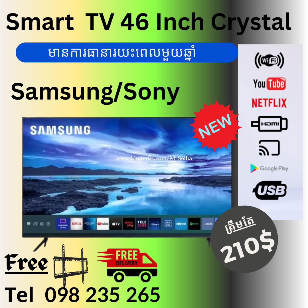😍 Samsung &Sony Smart TV 📣តំលៃ special promotion ប្រេីប្រាស់បាន : ភ្ជាប់ WiFi YouTube Google App Netflix ភ្ជាប់ពី Computer ទៅTVបាន Share phone to TV 👉តំលៃគ្រប់ទំហំ 32Inch crystal =125$ 43 Inch= 170$ 46 Inch crystal = 210$ 55 Inch Crystal =310$ 60 Inch UHD Crystal 4k= 360$ 75 Inch UHD Crystal 4K= 450$ 80 Inch UHD crystal 4k =550$ 90 Inch UHD crystal 4k=680$ -ថែមជេីងចាប់ជញ្ជាំង1 -Free delivery -ធានា1ឆ្នាំ (warranty 1 year) Telegram or call 098235xxxClick To Call , 012235xxxClick To Call https://t.me/seihakong1 តំលៃពិសេសមិនធ្លាប់មាន