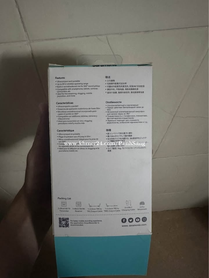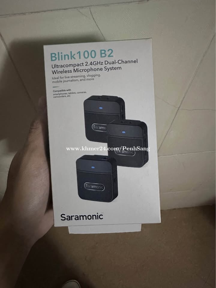 មីក្រូហ្វូន Saramonic Blink100 B2 ថ្មី មិនទាន់ប្រើពីមុន Audio Quality: 12-step gain control and selectable active noise cancellation to reduce background noise. Wireless Performance: Operates on the 2.4GHz spectrum with automatic pairing and a maximum range of up to 164 feet (50m). Compatibility: The receiver features a 3.5mm output and includes both 3.5mm TRS (for cameras) and 3.5mm TRRS (for mobile devices) cables. Battery Life: Offer up to 10 hours of recording time on a single charge. Components: Includes two transmitters (TX), one receiver (RX), furry windscreens, and USB-C charging cables Microphone Saramonic Blink100 B2 New, haven't used before. #Wirelessmicrophone