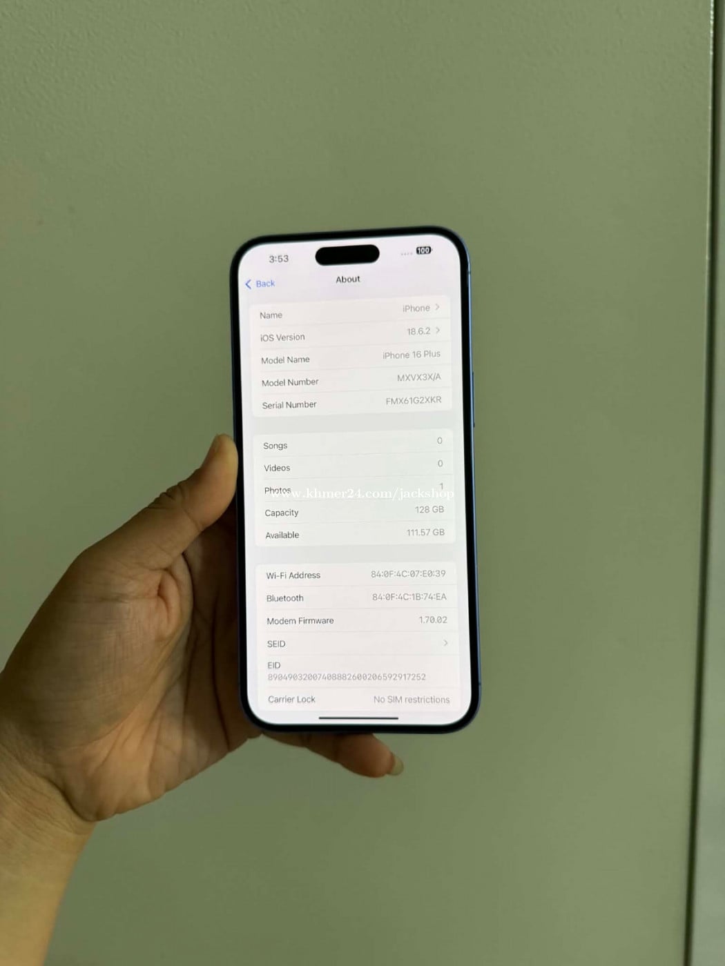 iPhone 16 Plus 128g X/A Sim1+Esim Scan 97% ធានាទូរស័ព្ទសុំនុំហ្សុីនណែន100% Freeផ្លុំ ថ្មកាន់ កាំមេរ៉ាច្បាស់មុខក្រោយ ធានាលើការប្រើប្រាស់15ថ្ងៃ(only phone) 0969000xxxClick To Call telegram
