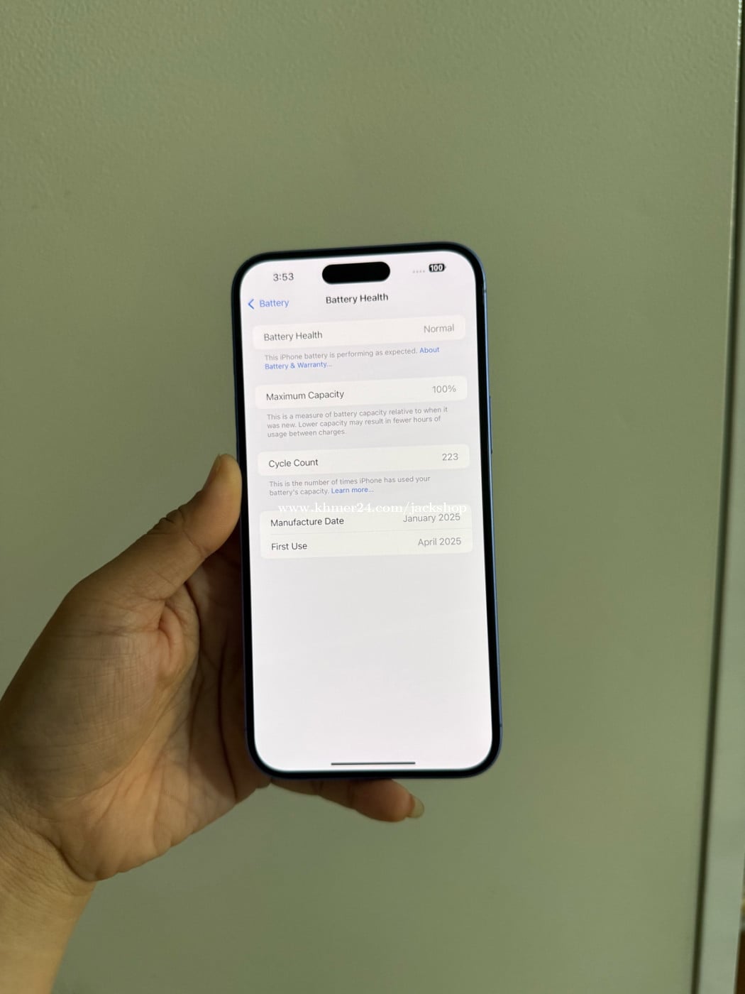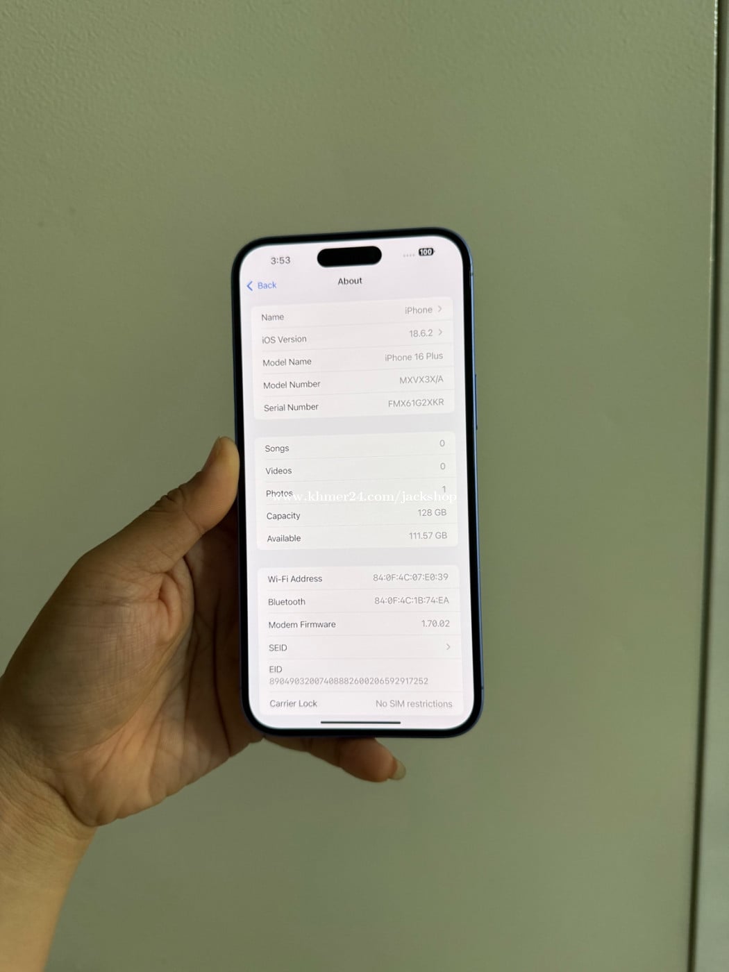 iPhone 16plus 128g X/A Sim1+Esim Scan 97.5% ធានាទូរស័ព្ទនឹងម៉ាសុីនសុំនុំហ្សុីនណែន100% Freeផ្លុំ ថ្ម100% មិនដែរដោះមិនដែរជួសជុល ថ្មកាន់ កាំមេរ៉ាច្បាស់មុខក្រោយ ធានាលើការប្រើប្រាស់15ថ្ងៃ(Only Phone)0969000xxxClick To Call telegram