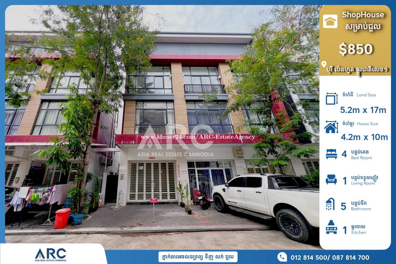 🏡បុរីប៉េងហួតបឹងស្នោរ ផ្លូវជាតិលេខ១ Shophouse For Rent | 店屋出租 🔹 Rent Price | 租金: $850 (可协商) 🔹 House size| 建筑面积: 5.4m x 17m 🔹 land size | 土地面积: 4.2m x 10m 🔹 Bedroom | 房间: 04 🔹 Bathroom | 卫生间:05 📍 ទីតាំងត្រឹមតែ03នាទីពី ទីក្រុងរណបកោះពេជ្រនឹងកោះនរា បរិយាកាសល្អ សម្រាប់ពត៏មានបន្ថែមសូមទំនាក់ទំនងមកលេខទូរស័ព្ទ 👇 ☎️012814xxxClick To Call | 087814xxxClick To Call | 096493xxxClick To Call 4 Telegram : https://t.me/interested_call_me Channel : https://t.me/ARC_Chbar_am_Pov #villaforrent #ផទះជួល #ChbarAmPo #shophousesale #Houserental #shophousesale #បេងហ៊ួងបឹងស្នោរ