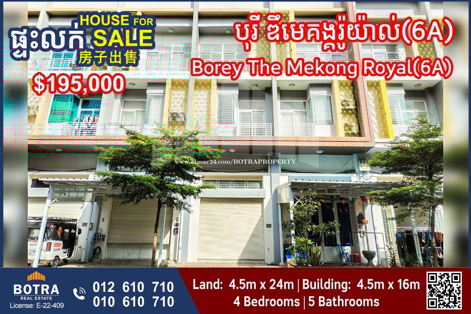 ๐ก Shophouse for Sale #P1303 ๐ Borey The Mekong Royal(6A) - Land Size: 4.5m x 24m - House Size: 4.5m x 16m - 4 Bedrooms | 5 Bathrooms ๐ Price: $195,000 (Nego) โโโโโโโโโ Contact us now ๐ 012610xxxClick To Call (Cellcard) ๐ 010610xxxClick To Call (Smart) โถ๏ธ t.me/BotraRealEstate (Chat)