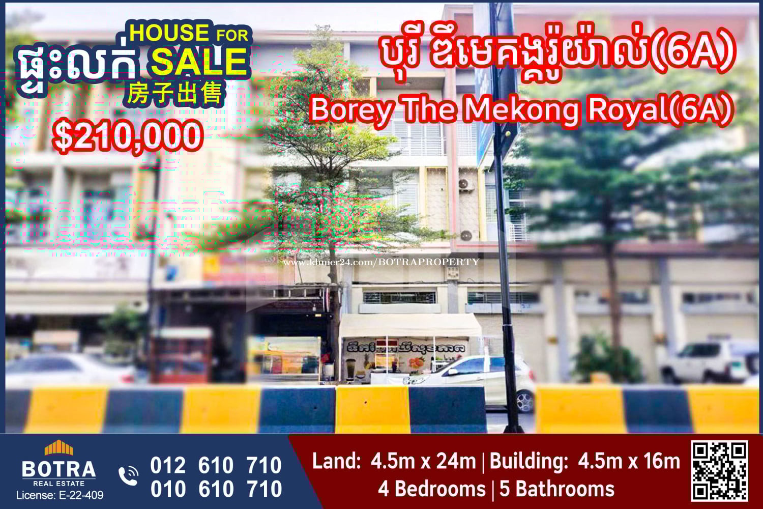 ๐ก Shophouse for Sale #P1307 ๐ Borey The Mekong Royal(6A) - Land Size: 4.5m x 24m - House Size: 4.5m x 16m - 4 Bedrooms | 5 Bathrooms ๐ Price: $210,000 (Nego) โโโโโโโโโ Contact us now ๐ 012610xxxClick To Call (Cellcard) ๐ 010610xxxClick To Call (Smart) โถ๏ธ t.me/BotraRealEstate (Chat)