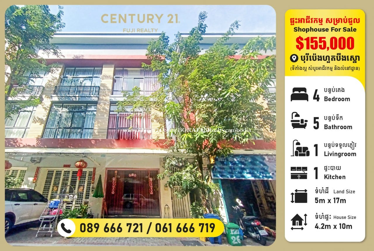Shophouse for Sale Peng Houth Boueng Snor - Price Sale: $155,000 - House size: 4.2m x 10m - Land size: 5m x 17m - Bedroom: 4 | Bathroom: 5 Contact for Viewing or More Info: