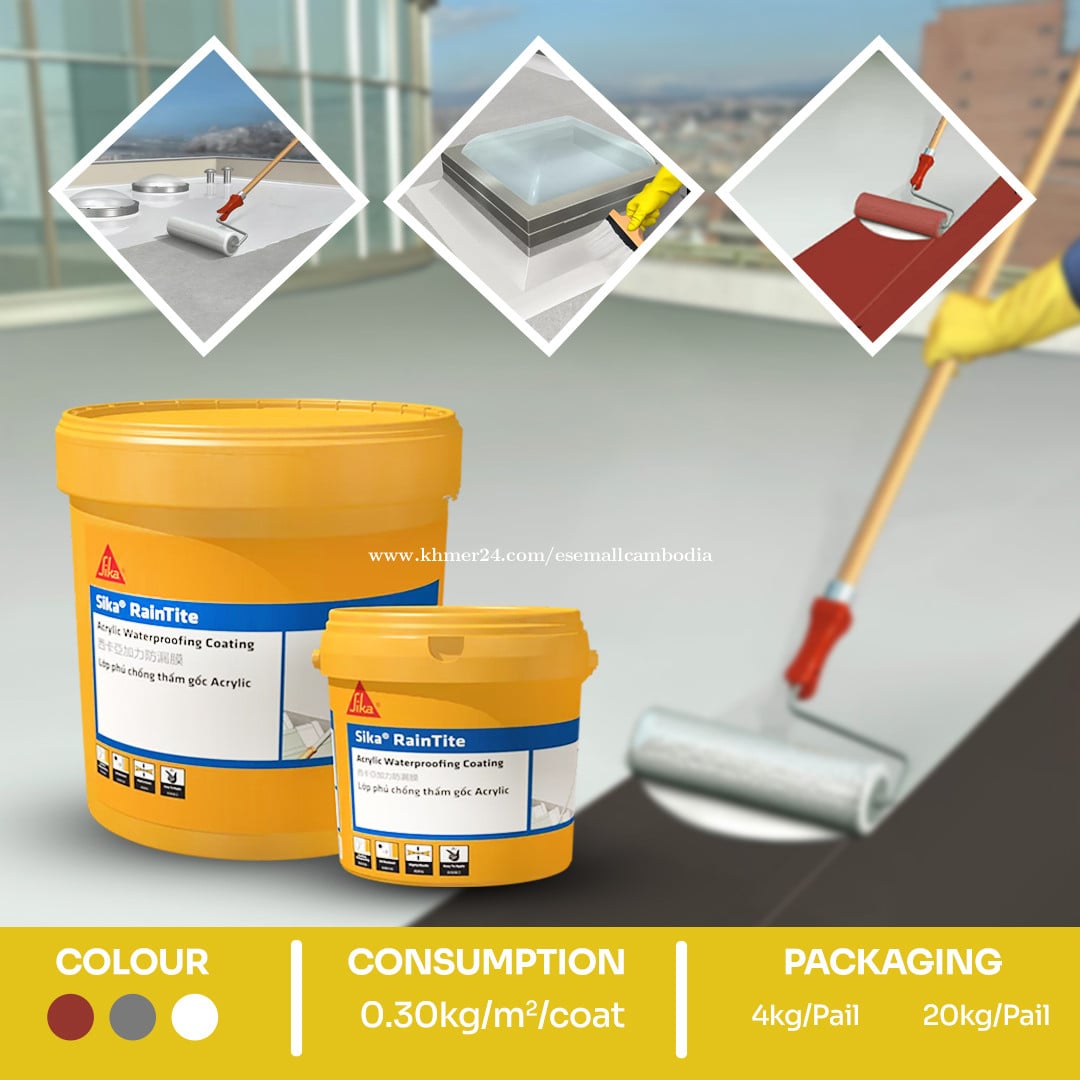Sika® RainTite – ផលិតផលលាបការពារជម្រាបទឹកដំបូលដែលធន់នឹងពន្លឺថ្ងៃ(ប្រភេទ Acrylic) 🛡️ ប្រភេទ៖ ផលិតផលលាបការពារជម្រាបទឹក 🏷 ម៉ាក៖ Sika 🧪 ប្រភេទសារធាតុ៖ Acrylic Based 🎨 ពណ៌៖ Grey / White / Red 🪣 ការវេចខ្ចប់៖ ធុង 📦 បរិមាណ៖ 4kg 🆕 សភាព៖ ថ្មី 100% ⭐ ពណ៌នាផលិតផល Sika® RainTite គឺជាថ្នាំលាបការពារជម្រាបទឹកប្រភេទ Acrylic មានស្រាប់ប្រើ មិនចាំបាច់លាយ។ សមស្របសម្រាប់ការពារការជ្រាបទឹកពីភ្លៀង និងសំណើមលើដំបូល និងផ្ទៃខាងក្រៅផ្សេងៗ។ បន្ទាប់ពីលាប ស្រទាប់ថ្នាំមានភាពយឺតបត់ (Elastic) មិនងាយប្រេះ ឬបែក និងធន់នឹងពន្លឺថ្ងៃ។ ⭐ លក្ខណៈពិសេស ✅ ការពារការជ្រាបទឹក និងសំណើមបានល្អ ✅ មានស្រាប់ប្រើ មិនចាំបាច់លាយ ✅ ស្រទាប់យឺតបត់ មិនងាយប្រេះ ✅ ជាប់ល្អលើបេតុង ស៊ីម៉ង់ និងផ្ទៃសំណង់ ✅ លាបងាយ និងស្ងួតលឿន 📏 អត្រាប្រើប្រាស់ (Consumption) 0.30 kg/m² / ជាន់ (ណែនាំលាប 2–3 ជាន់ អាស្រ័យលើសភាពផ្ទៃ) 🏠 សមស្របសម្រាប់ ដំបូលបេតុង / ដំបូលសន្លឹក ជញ្ជាំងខាងក្រៅ តំបន់ជ្រាបទឹក និងរន្ធប្រេះតូចៗ សំណង់លំនៅឋាន និងអគារទូទៅ 🛠 វិធីប្រើប្រាស់សង្ខេប សម្អាតផ្ទៃឱ្យស្អាត និងស្ងួត លាបដោយជ័ររ៉ូល ឬជ័រប្រាស់ លាប 2–3 ជាន់ ទុកឱ្យស្ងួតតាមការណែនាំ